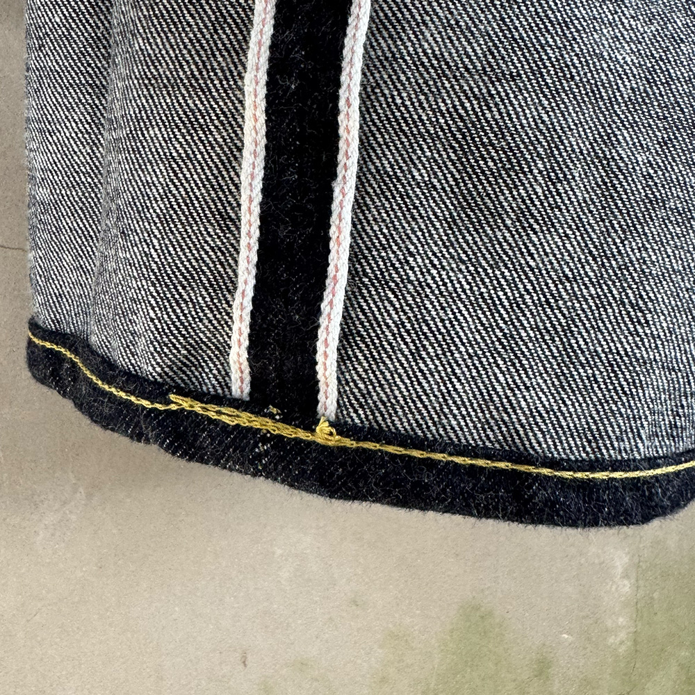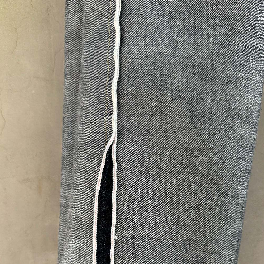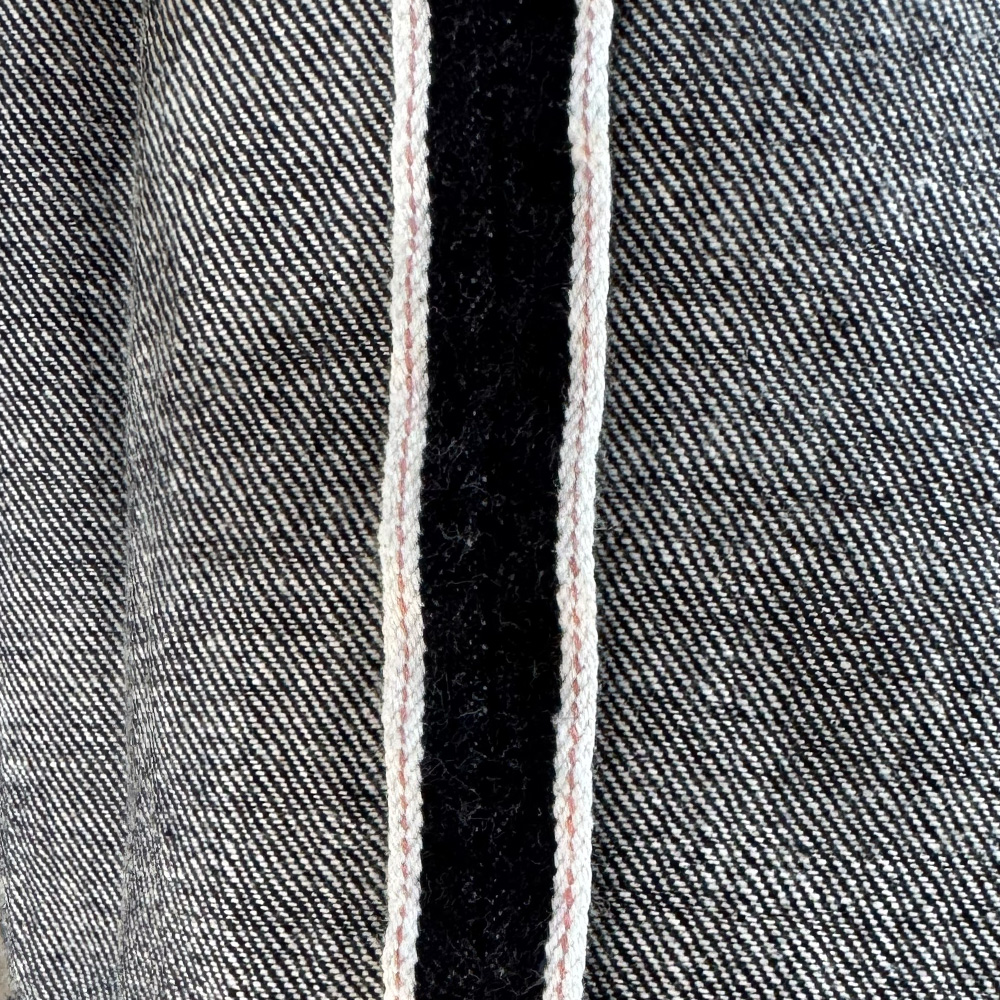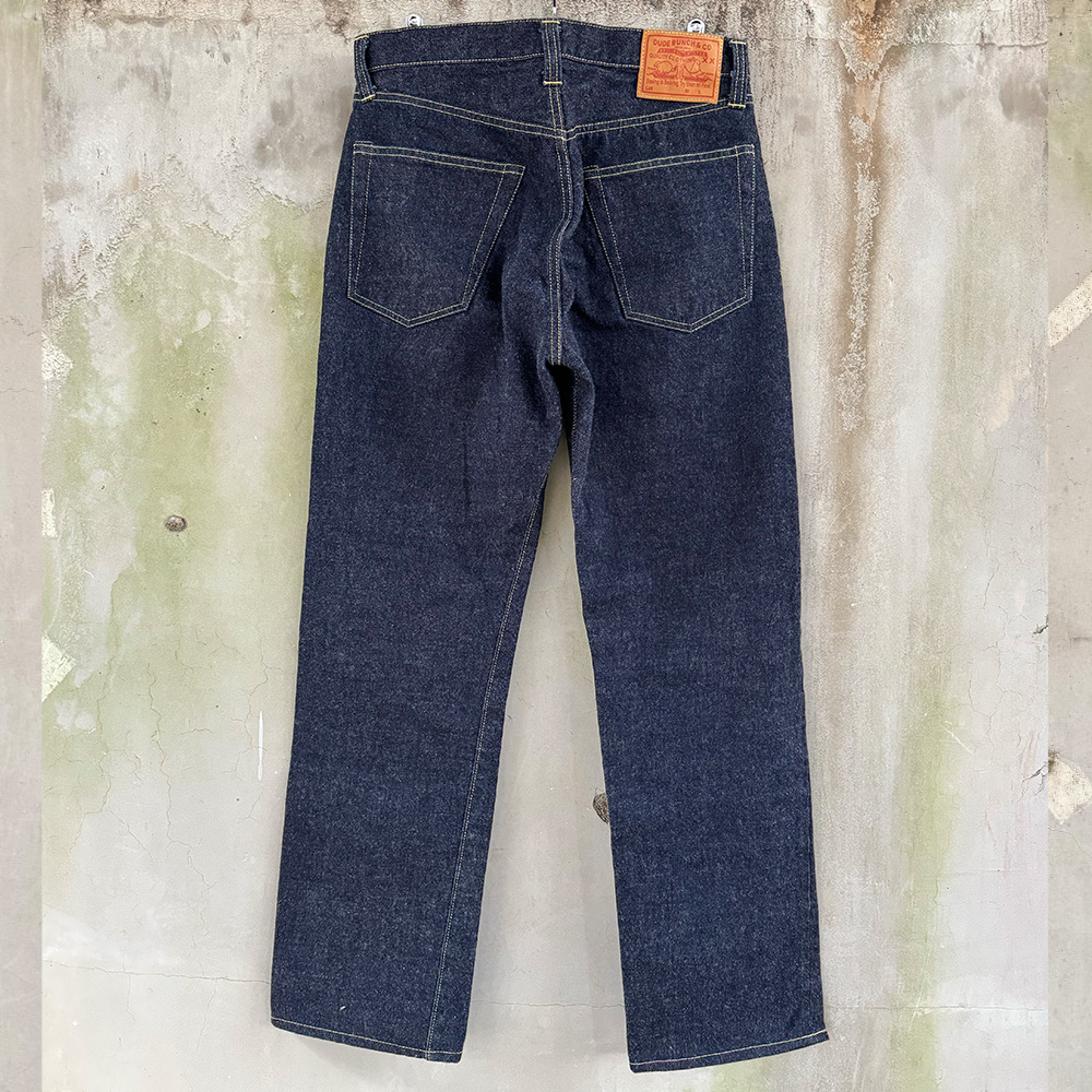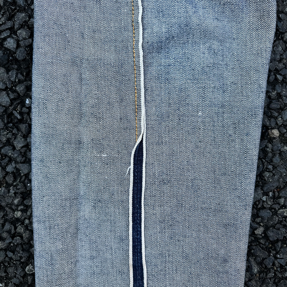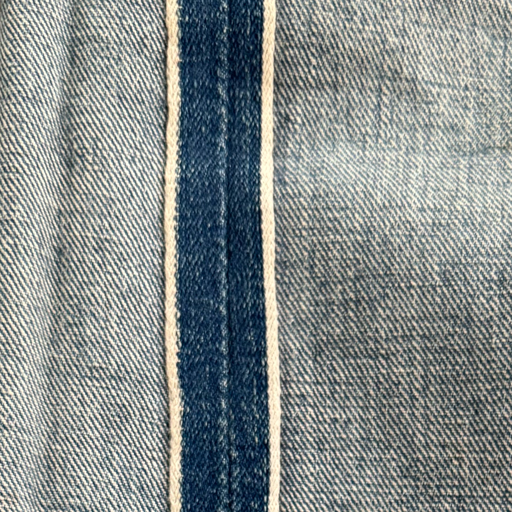 デュードバンチの生地はセルビッチデニムと呼ばれる、旧式シャトル織機で丁寧に織り上げた希少なデニム生地です。端の「ミミ」部分にはほつれ止めが施され、あえてリーバイスと同じ赤い糸で仕上げられた「赤耳」は、ビンテージデニムの象徴のような意匠でもあります。通常のデニム生地の横巾が54inch(約150cm)あるのに対して、ミミのある旧式シャトル織機では27〜28inch(約76cm)ほどしか織れないのです。ゆっくりと織ることで生まれる生地のムラや凹凸が、穿き込むほどに美しいアタリを生み、経年変化を存分に楽しめます。セルビッチデニムとは、速度も遅く生産量も少なく、手間と時間をかけた生産のため、数量も限られた特別なデニム生地なのです。