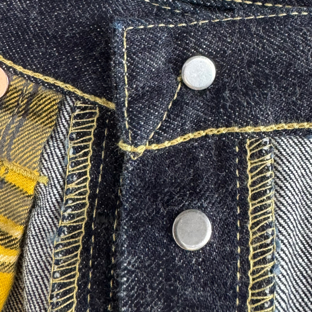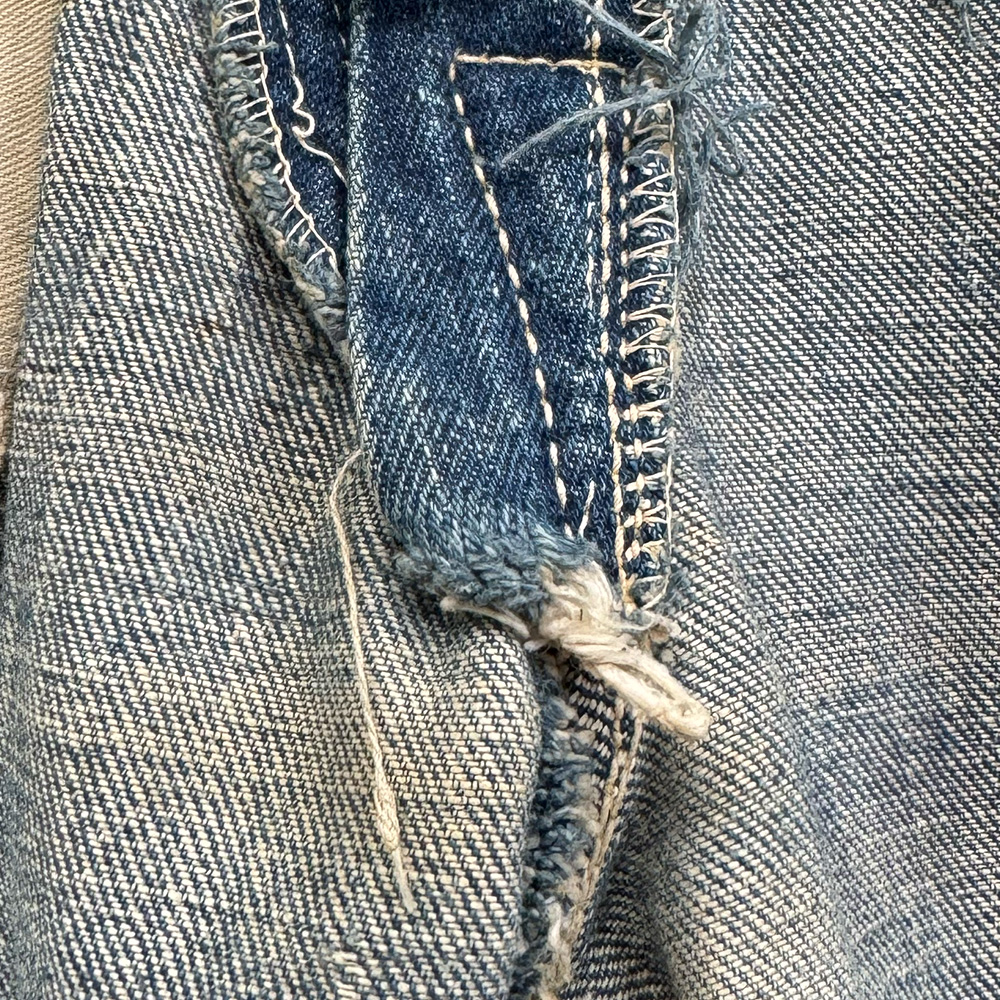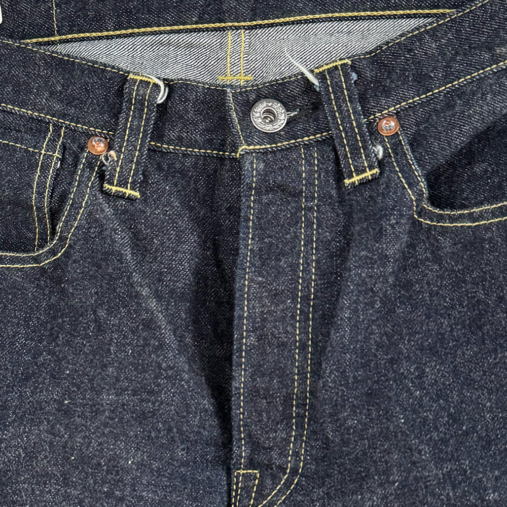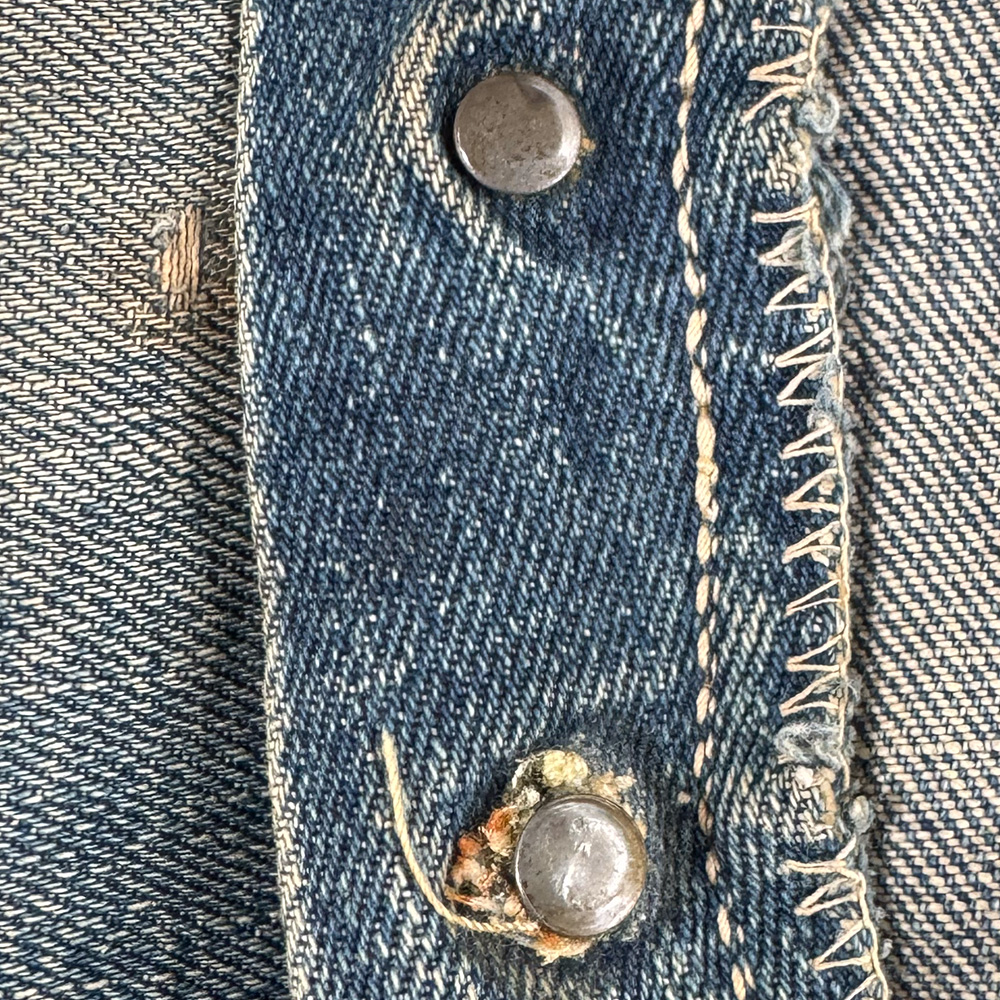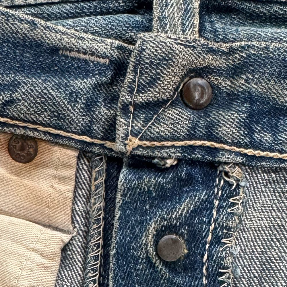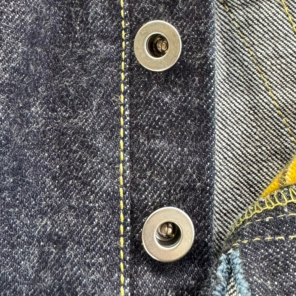 大戦モデルといえば鉄ボタンの採用です。戦時下の物資統制で銅を優先的に減らした過程で生まれた刻印などのない鉄ボタンを採用しています。鉄は錆びることから生地への負担もあり、現在ではあまり使われることがなくなってきており、扱っている会社も少なくなってきています。そんな中でも当然デュードバンチは鉄製ボタンをあしらっていますので、履き込んでいくことで錆び始めたボタンと褪色した生地のコントラストをお楽しみいただけます。※写真の501SXXは過渡期モデルで、ボタンが刻印になっています。