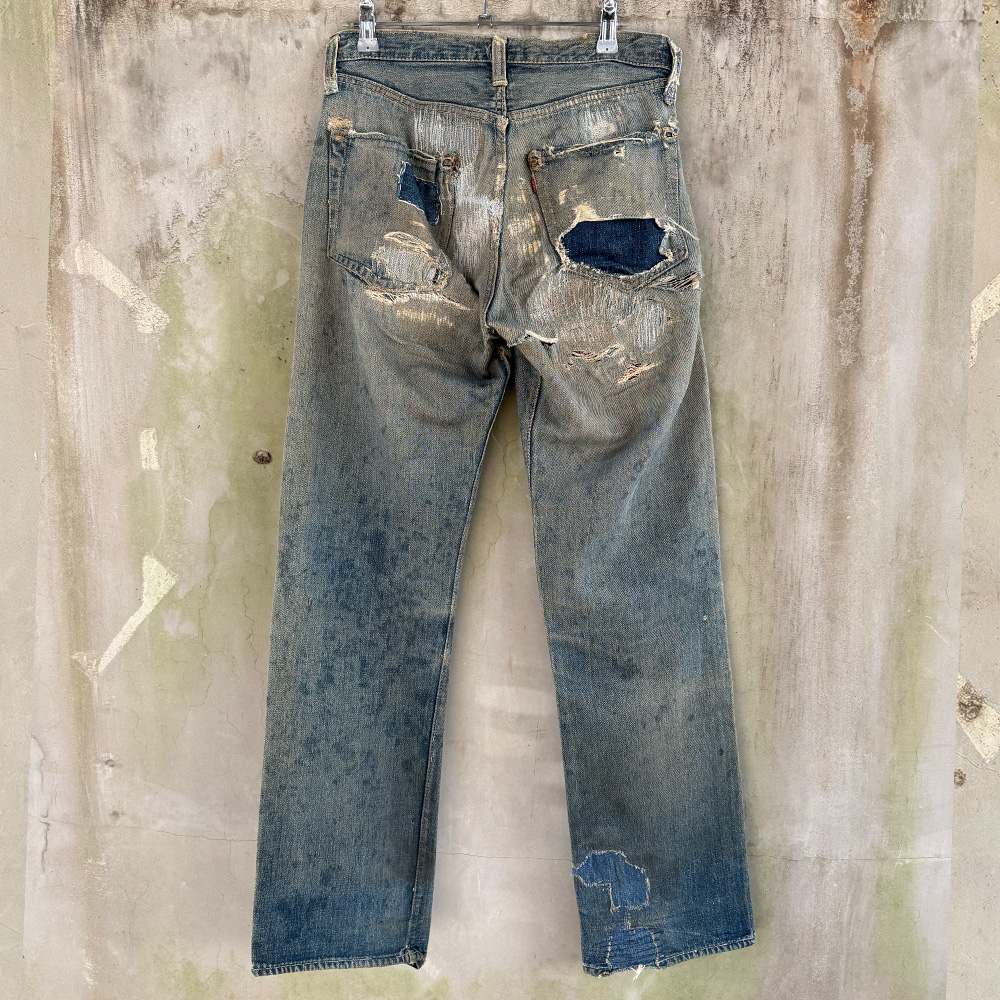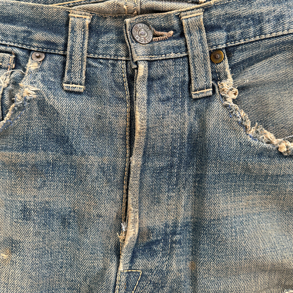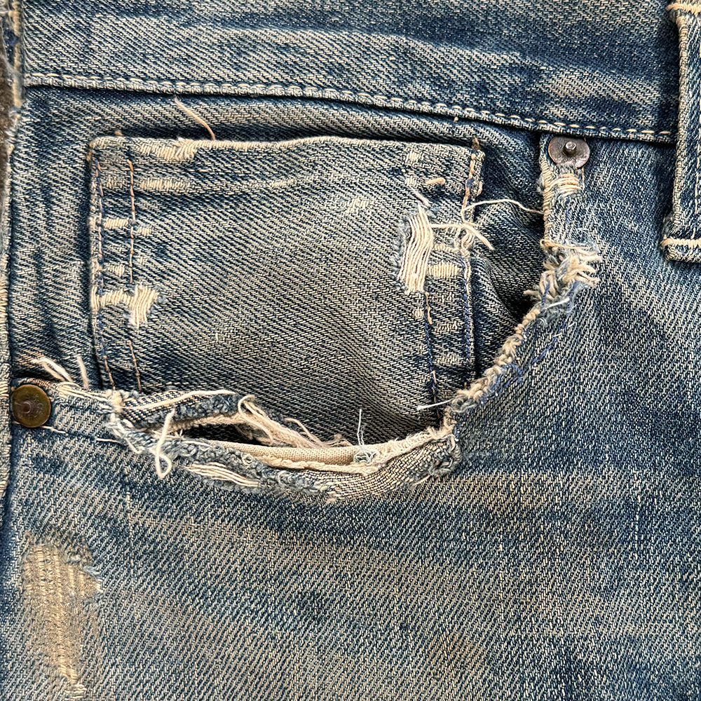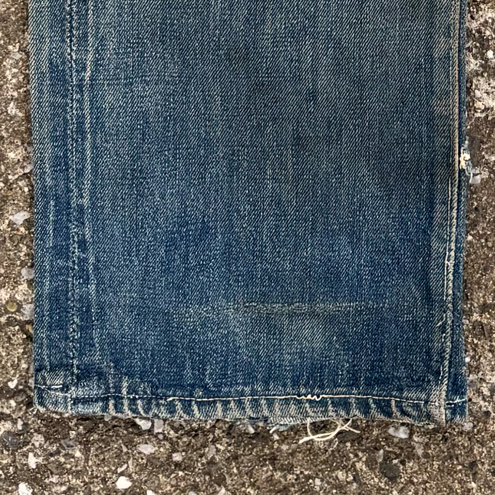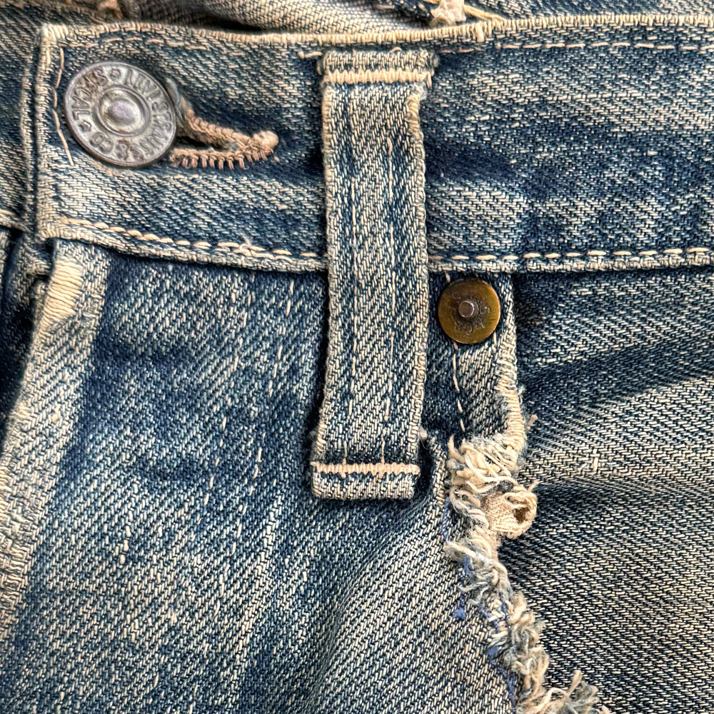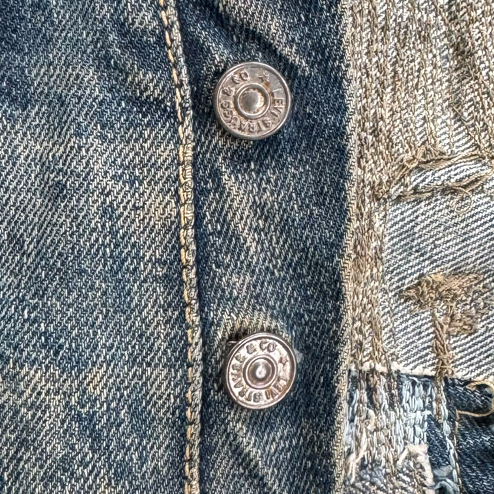 大戦モデルといえば鉄ボタンの採用です。戦時下の物資統制で銅を優先的に減らした過程で生まれた刻印などのない鉄ボタンを採用しています。鉄は錆びることから生地への負担もあり、現在ではあまり使われることがなくなってきており、扱っている会社も少なくなってきています。そんな中でも当然デュードバンチは鉄製ボタンをあしらっていますので、履き込んでいくことで錆び始めたボタンと褪色した生地のコントラストをお楽しみいただけます。※写真の501SXXは過渡期モデルで、ボタンが刻印になっています。