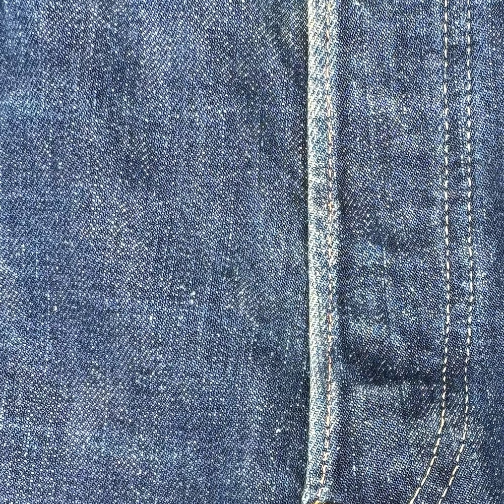 日本でも有数の個性的なデニム生地を生み出し続けている岡山県井原市のデニム生地工場。事務所は県の重要文化財にも指定されている老舗の生地工場です。栗原氏が所有するリーバイス501XX 1947年製モデルを持ち込み、経糸緯糸の本数や太さ、強めのネップ感、通常の染め回数よりも多く青黒い1947年特有の色味を再現したインディゴなど、日本綿布のノウハウが凝縮した至高の生地となります。防縮加工も毛焼き加工もしていない純粋な生機の生地ですので、履き込んでいくと全体が右に捩れていき、ヴィンテージ感を増していきます。今回のデュードバンチ製大戦モデルでは、リーバイスと同様右綾を採用していますので、これまでの実験的な変化とは違い、リーバイスのあの大戦モデルにグッと近づけた仕上がりを狙っております。