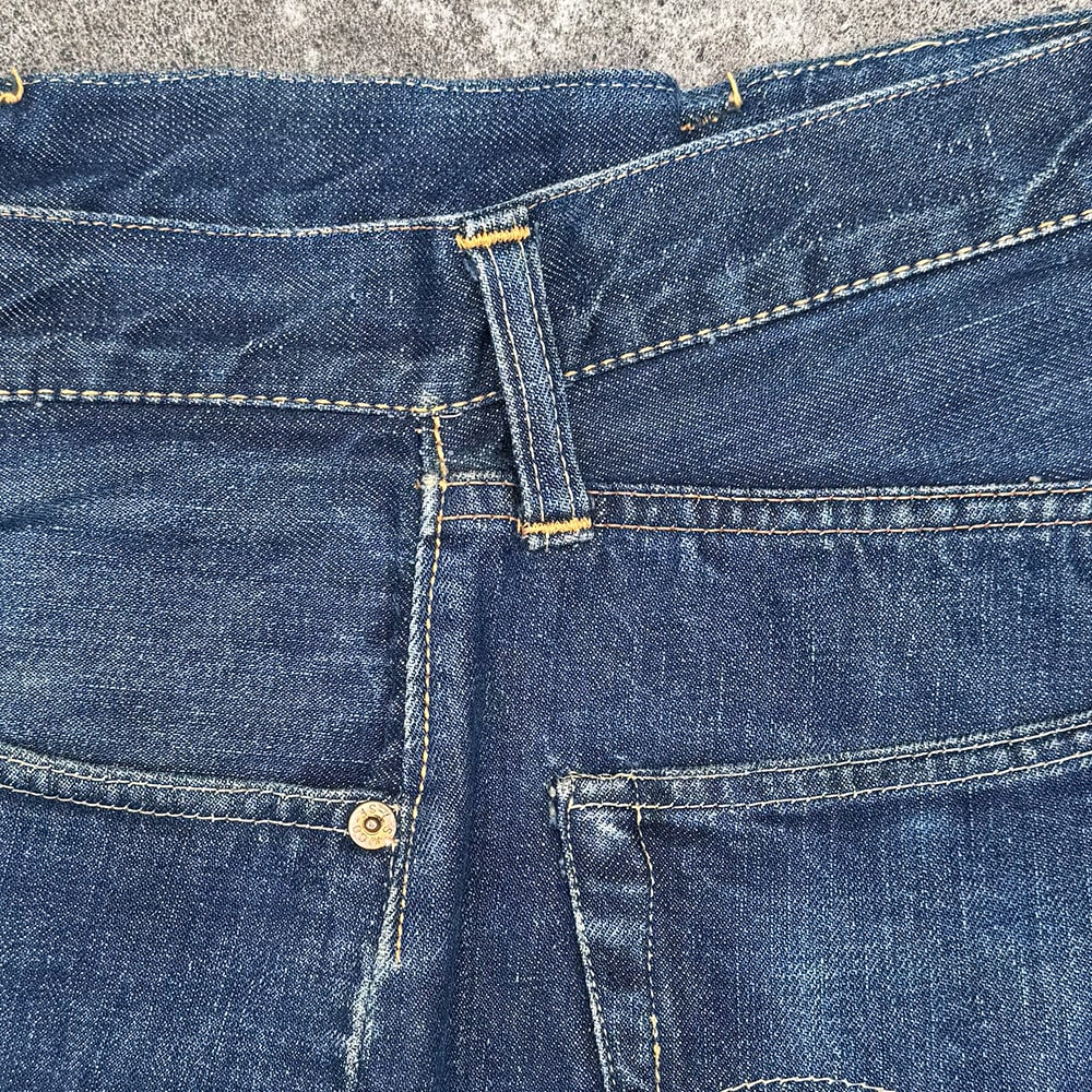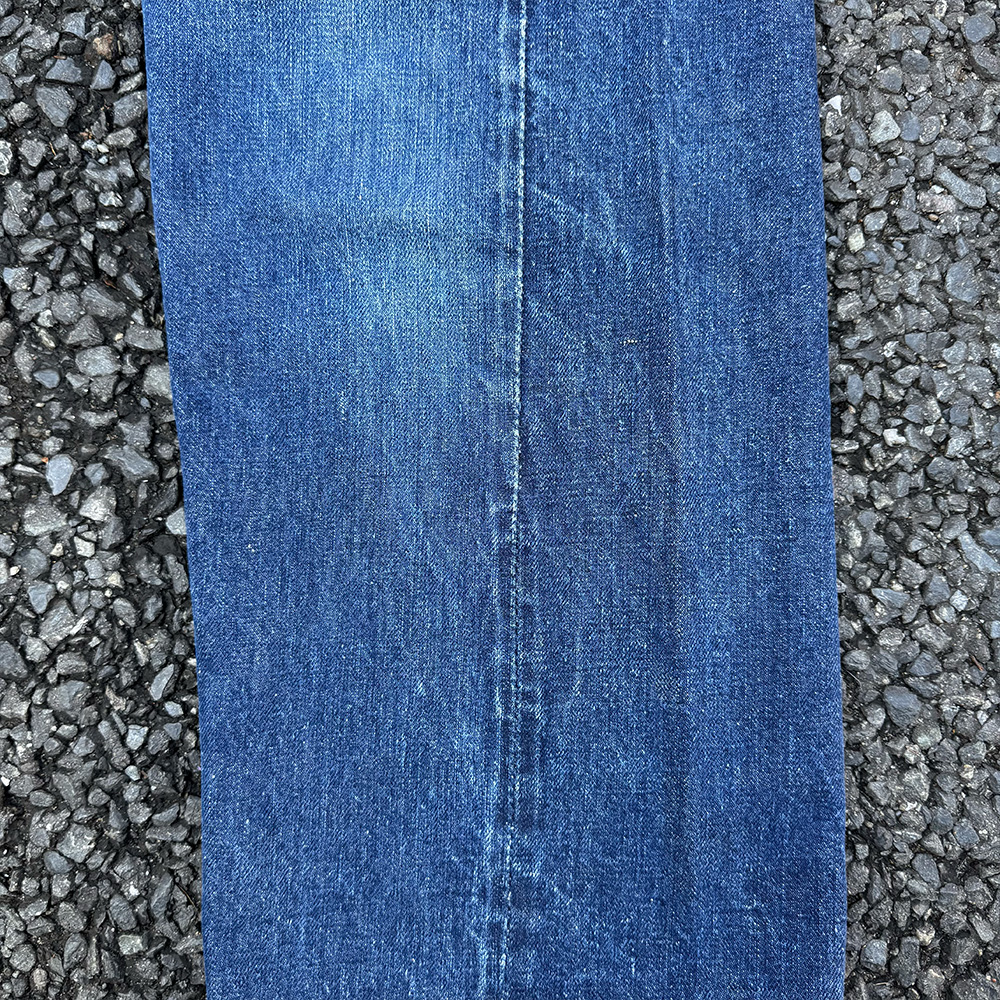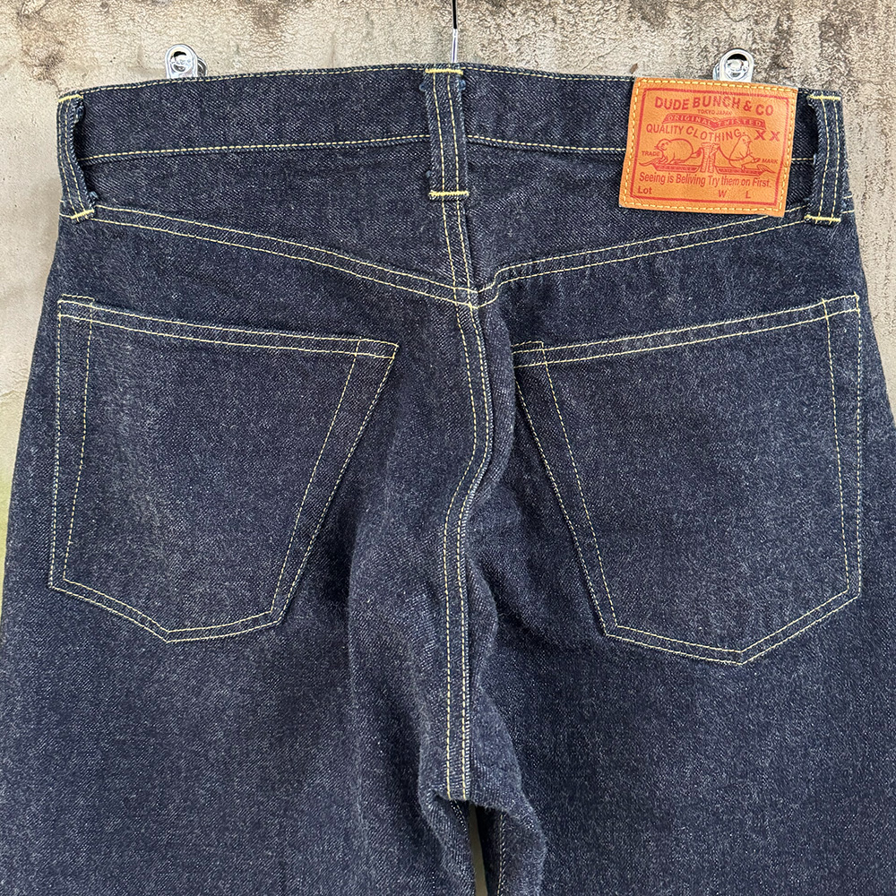 日本ではミミのアタリが出ることが良いとされ、製品時点で綺麗にミミを開いて納品される商品がほとんどです。それだけ日本人が几帳面で縫製に真摯に取り組んでいることの象徴的なエピソードですが、実際当時のアメリカのリーバイスはミミを丁寧に開いて店頭で売られていたのでしょうか。それを履く労働者もまた綺麗なミミのアタリを意識していたでしょうか。ヴィンテージに対してよりナチュラルなアプローチを考えた際、デュードバンチでは敢えてミミを開かない仕上げを選択しました。個体によって片側だけアタリが出たり、途中から開いたアタリが出たり、リアルなヴィンテージのアタリが生まれていくことを期待しています。もし綺麗に開いたアタリが欲しい場合は、かつてのように手元に届いた商品をアイロンで丁寧に開いてから履き始めることをお勧めします。