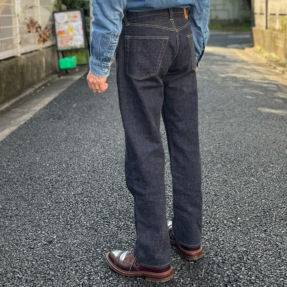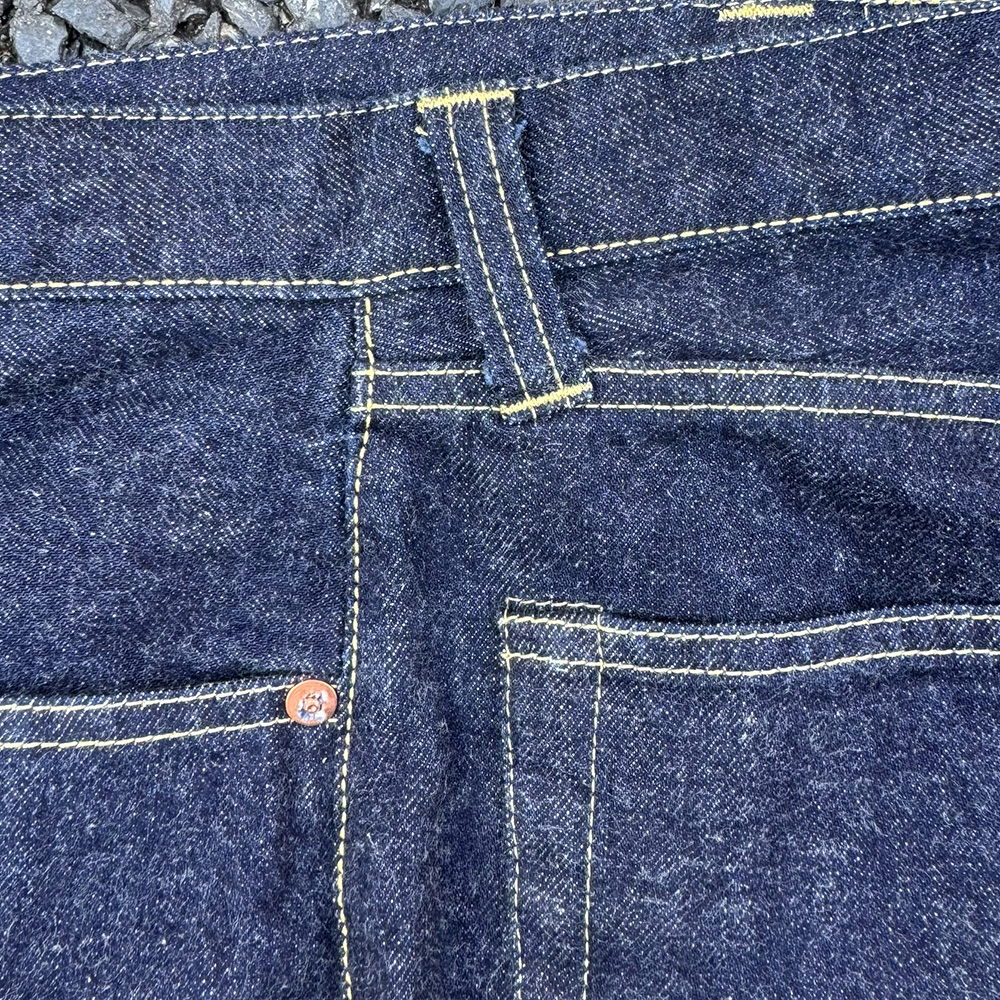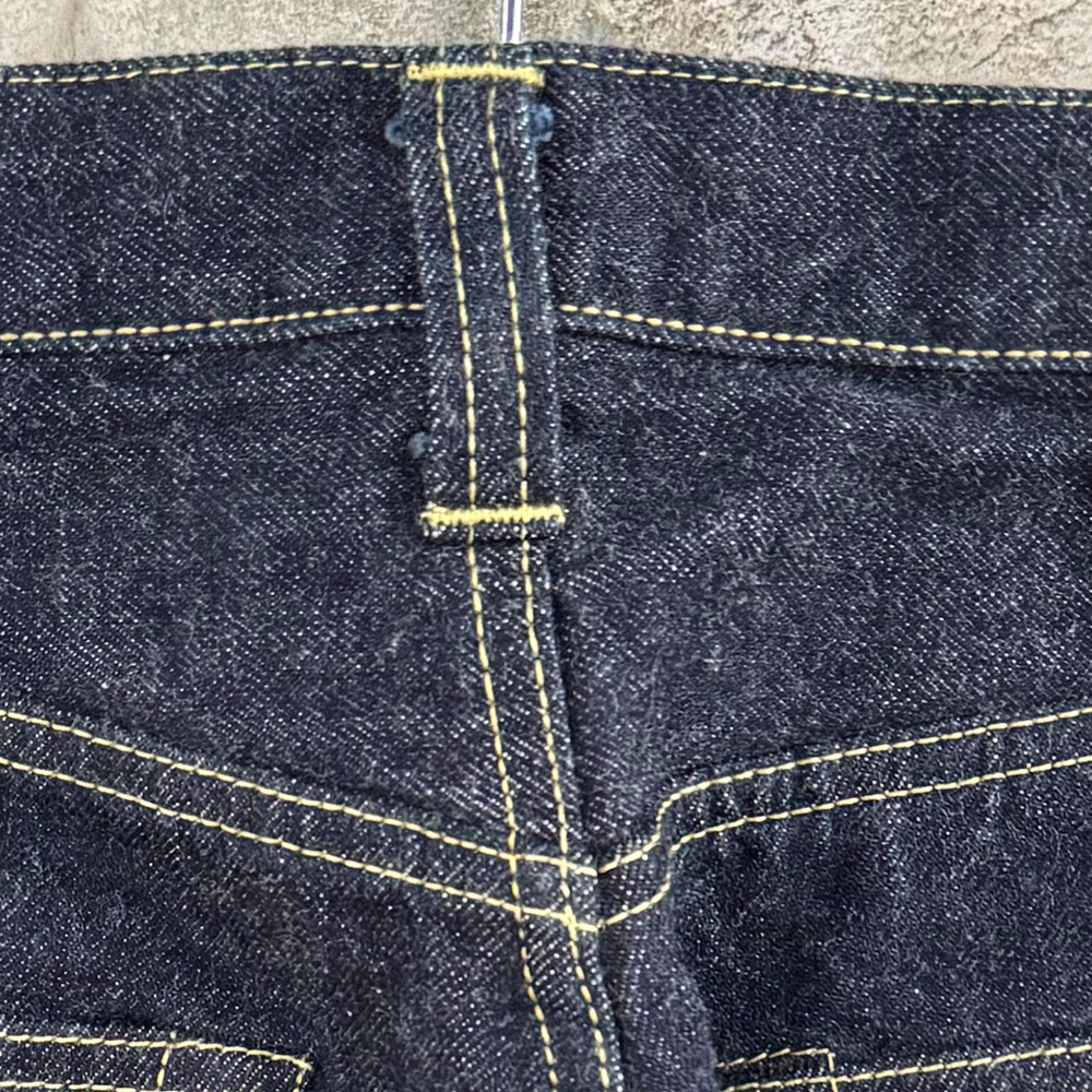 サイドのベルトループ部分は、生地が6枚重なる厚みがあるため、当時のミシンでは針折れを防ぐために、ループをわずかにねじるようにして縫製されていました。この仕様は生産機械の制約によるやむを得ない対応ですが、同時に当時の縫製現場の工夫と技術的背景を如実に物語るディテールです。こうした細部に思いを馳せることができるのも、ヴィンテージジーンズならではの魅力の一つして再現しています。