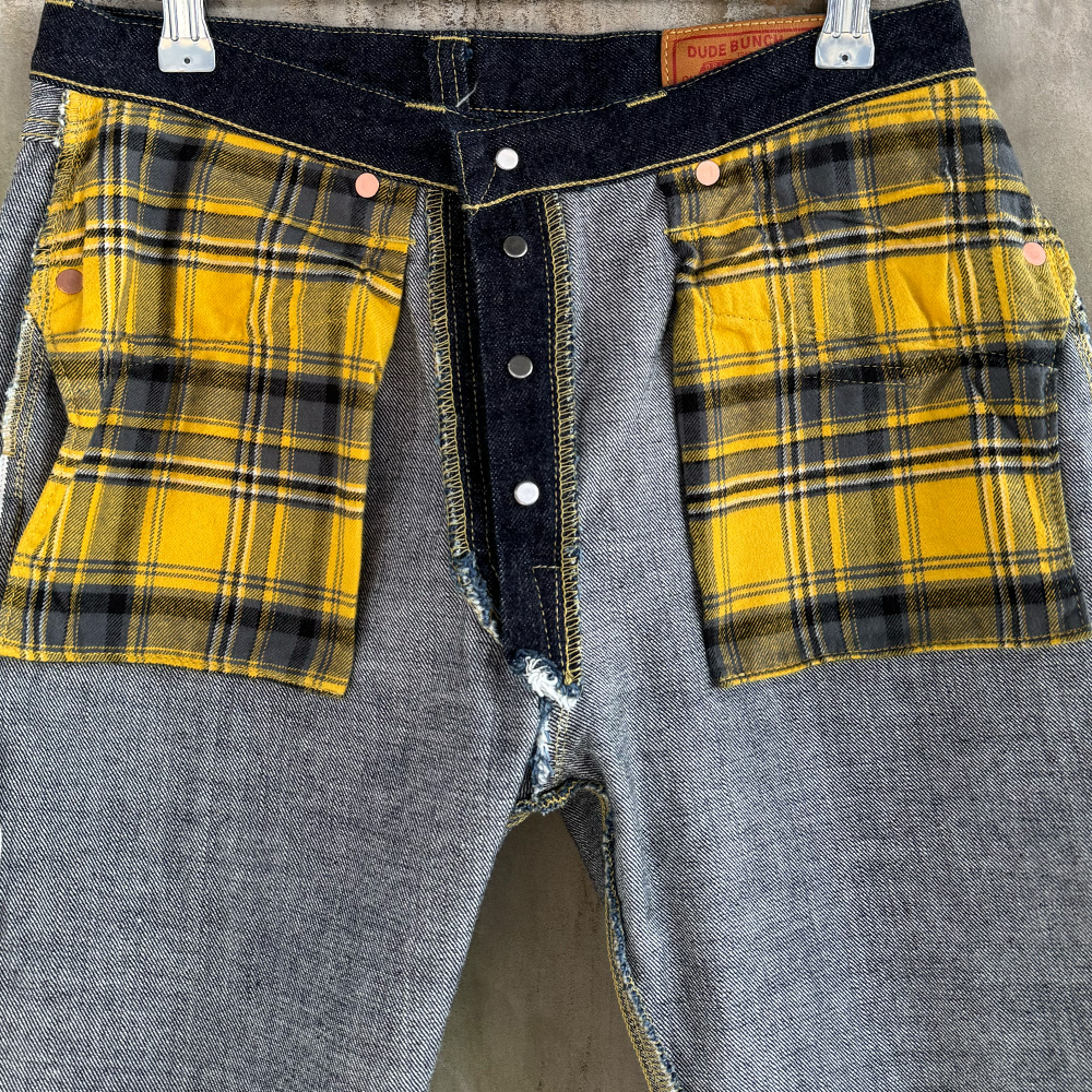 大戦モデルといえば様々な素材のスレキがついているディテールも楽しみのポイントです。帆布やネル生地など、様々な仕様が見られます。今回デュードバンチでは、イエロー系チェック柄の綿100%のネル生地を採用しました。イエローステッチと合わせて、経年変化とともに色褪せ、さらに内側は皮脂汚れによって緯糸の白色が茶色に変化していくのと同様にこのネル生地もチェック柄が薄れて茶ばんで風化していくことを狙っています。それはまるで実際にこのネル生地の個体が存在したかもしれない当時のヴィンテージに想いを馳せます。また、栗原氏が以前目にしたことがあるS501XXのヴィンテージと、伝説のレッドセルヴィッチ製大戦モデルに、チェック柄を採用していたモデルが存在したことからデザインソースを引用しています。ポケットサイズは「DB801XXE」同様、大型化するスマートフォンを前ポケットに収納できるようにあえて深めの設計としました。ただし強度は「DB801XXE」よりも落ちるのでご注意ください。