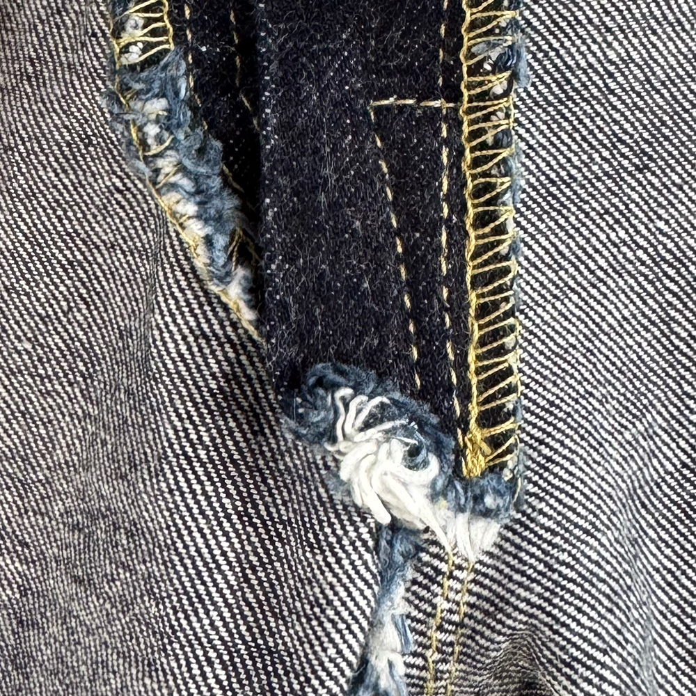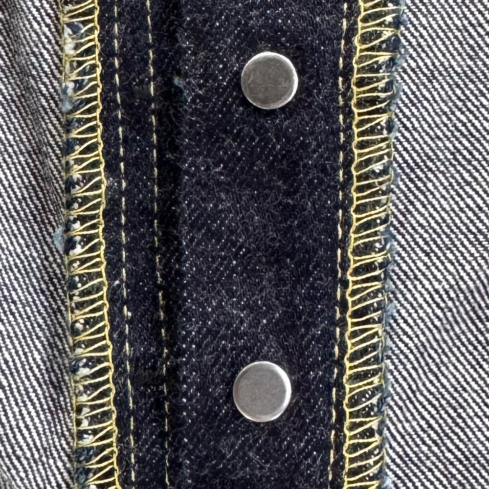 返し縫いの技術が未発達であった時代、縫製糸の端処理を安定させるために生まれたのがVステッチです。このVステッチ部分は縫い手の技術や癖が色濃く表れる個性豊かなディテールであり、今回の製作でも参考としたヴィンテージ個体の仕様を忠実に再現しています。ヴィンテージデニムを手に取る機会があれば、ぜひこのVステッチに注目してみてください。各個体ごとに異なる多様なパターンが存在していることが確認できます。国内の優れた縫製工場の高い技術の場合、綺麗で正確なステッチワークは得意なのですが、逆にこの下手ウマを再現するのが非常に難しく、狙ってこのステッチワークを再現するためにさらに高い技術を要しています。