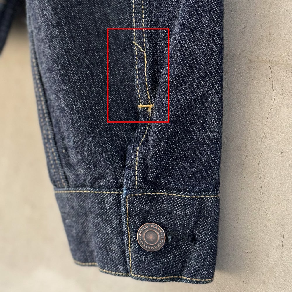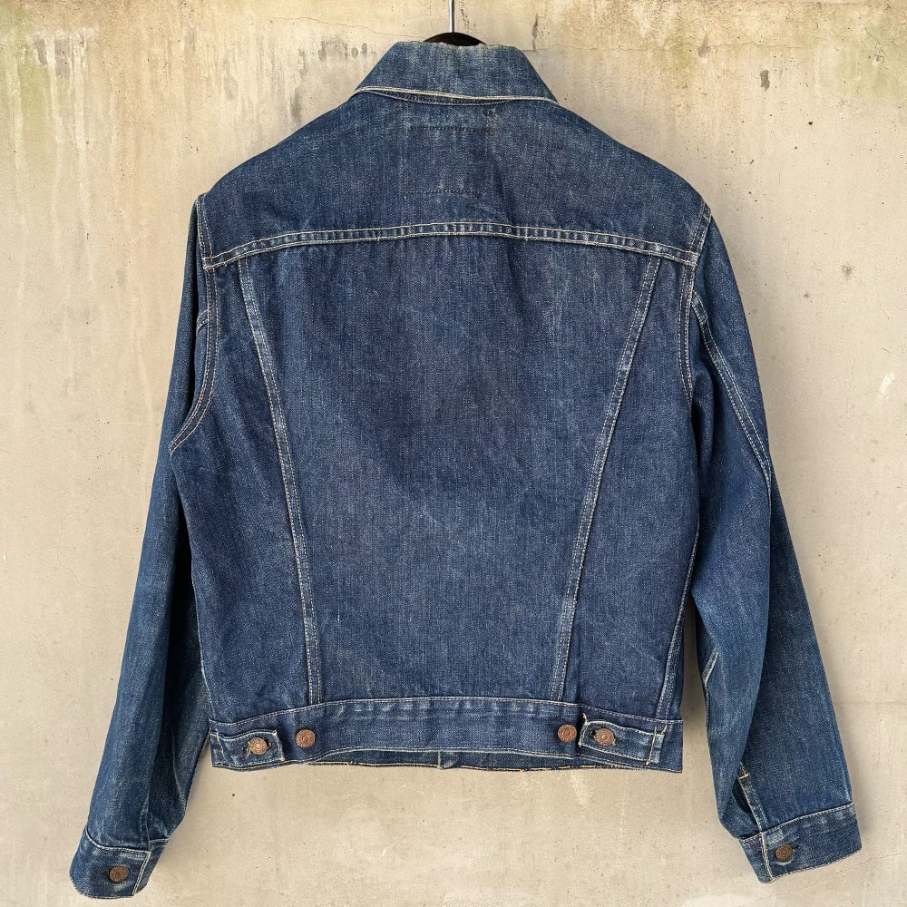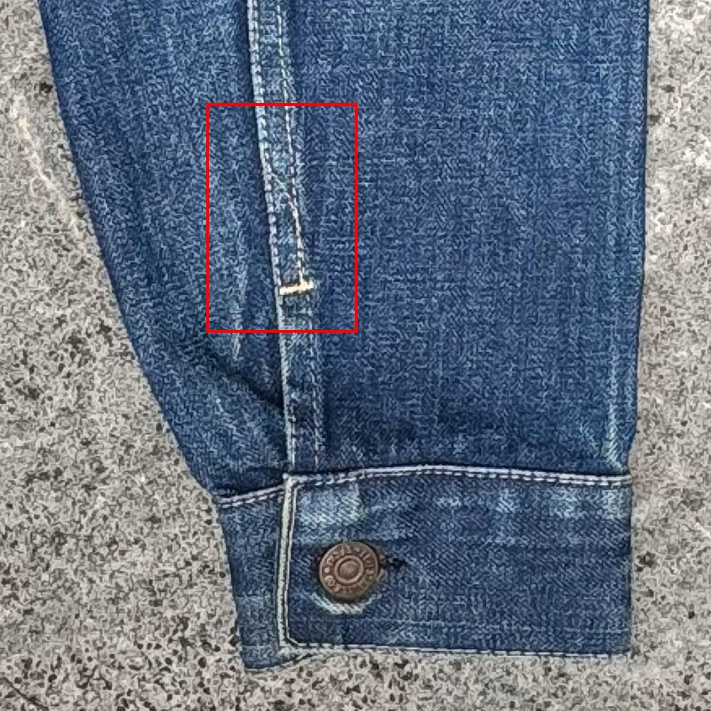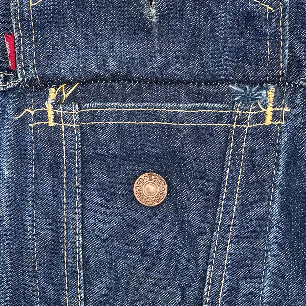 - 本来、リーバイスの4thタイプにおけるカンヌキ(カン留め)には、ブラックのステッチが用いられるのが定説とされています。しかし、本作では移行期特有の過渡的ディテールとして、先行する3rdタイプの仕様を踏襲し、イエローステッチによるカンヌキを採用しています。こうしたディテールは一見すると見過ごされがちですが、時代的背景や生産現場の実態を考慮すると、当時ならではの“仕様の揺らぎ”として非常に興味深い要素であり、隠れた魅力の一つといえます。