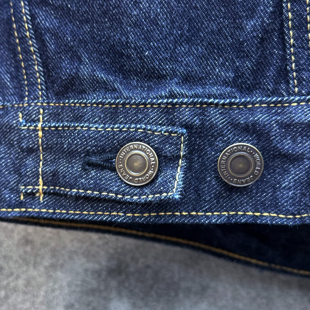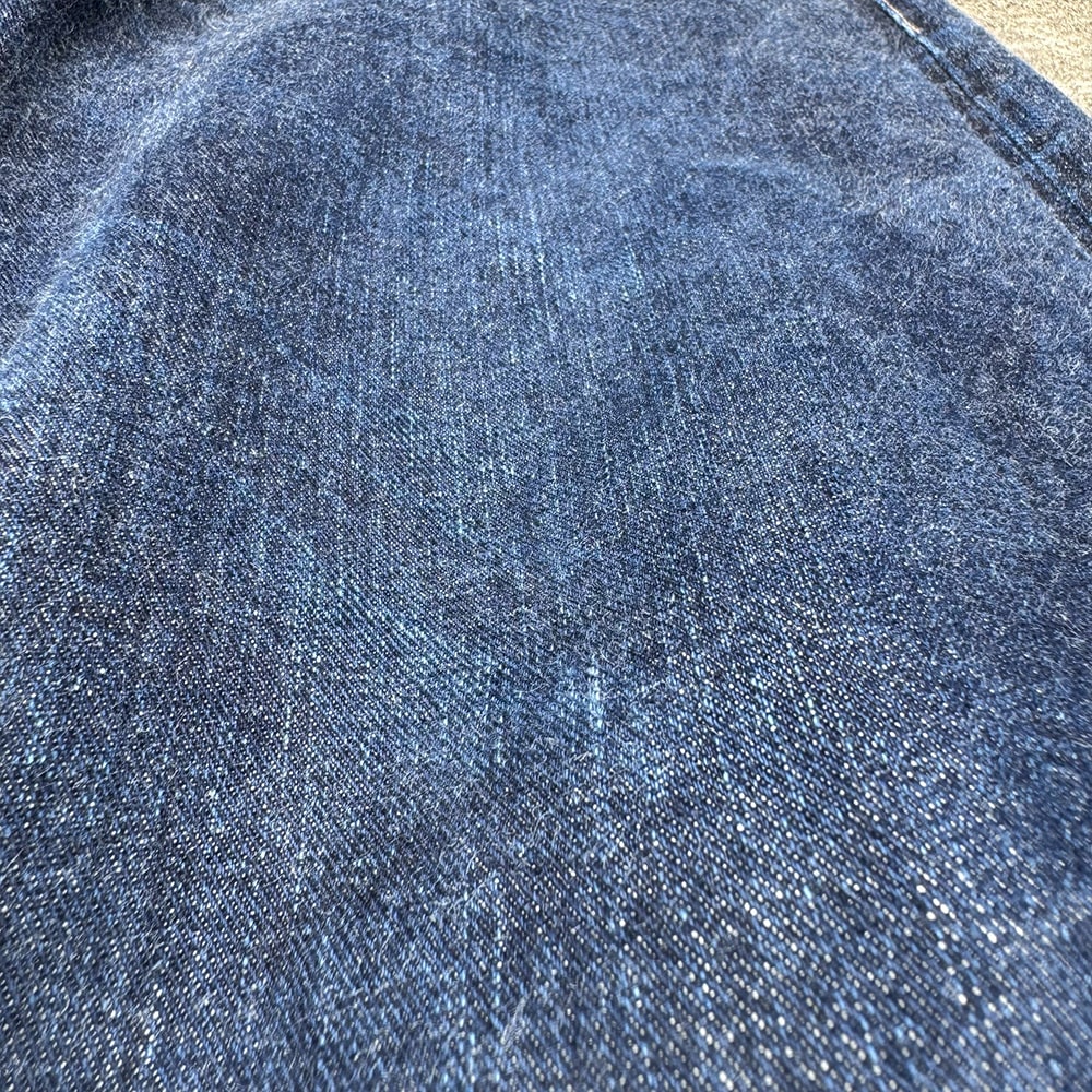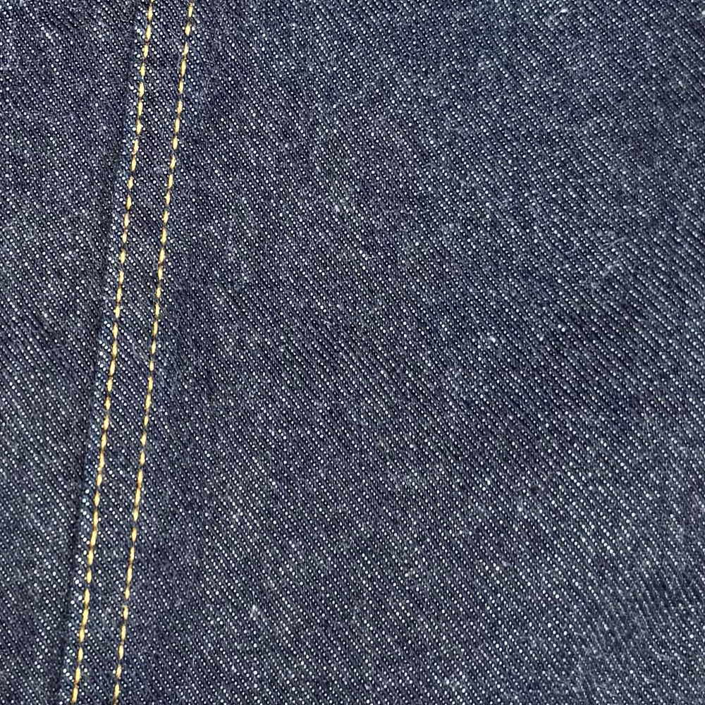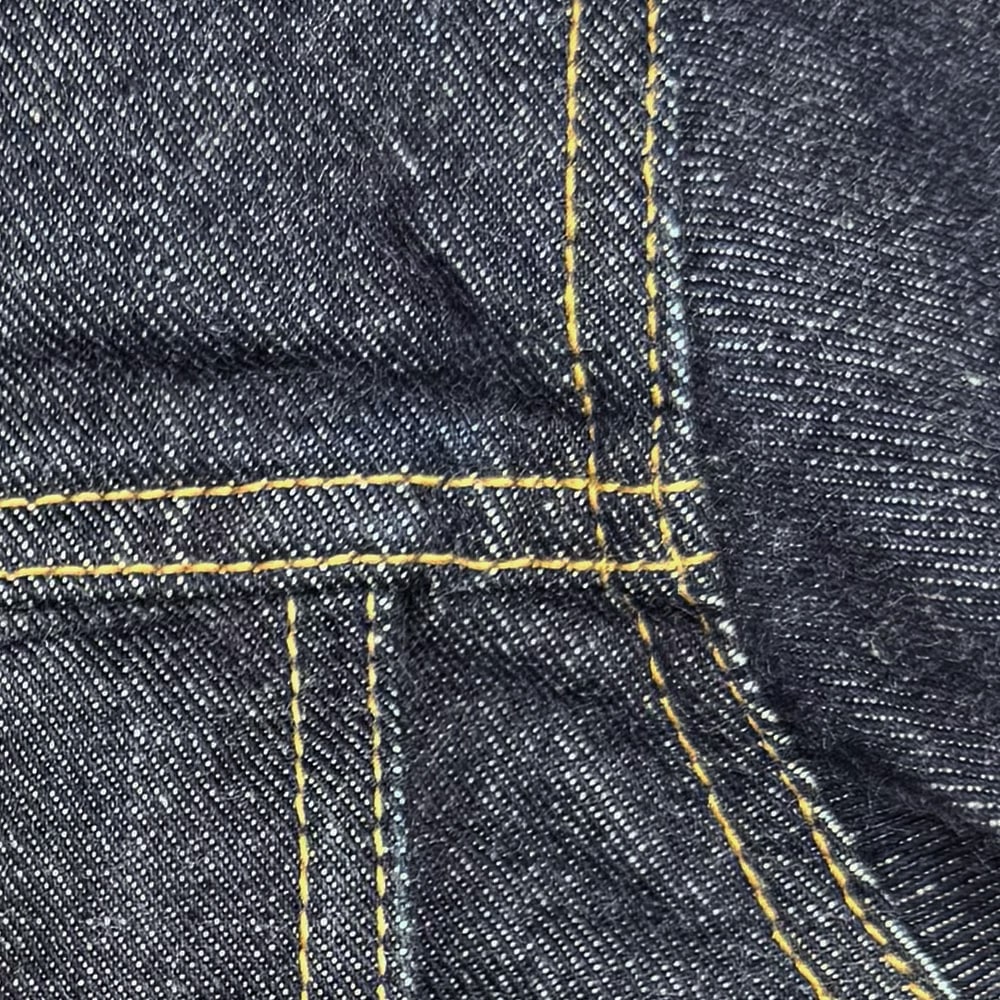 - 今回使用した黄色とオレンジの綿糸は、もともとは同じ色として用いられていたと考察したものです。製造時期やロットの違いによって経年変化に差が生じ、褪色の過程で黄色とオレンジに分かれて見えるようになったのではないか、という考えからこの2色を選びました。ワンウォッシュの状態ではほとんど違いが分かりませんが、着用や洗濯を重ねていくことで、それぞれの色の個性が際立ち、黄色とオレンジのコントラストが徐々に楽しめるようになっています。そんな色の変化も“育てる楽しみ”のひとつとして、遊び心とともに味わっていただければと思います。