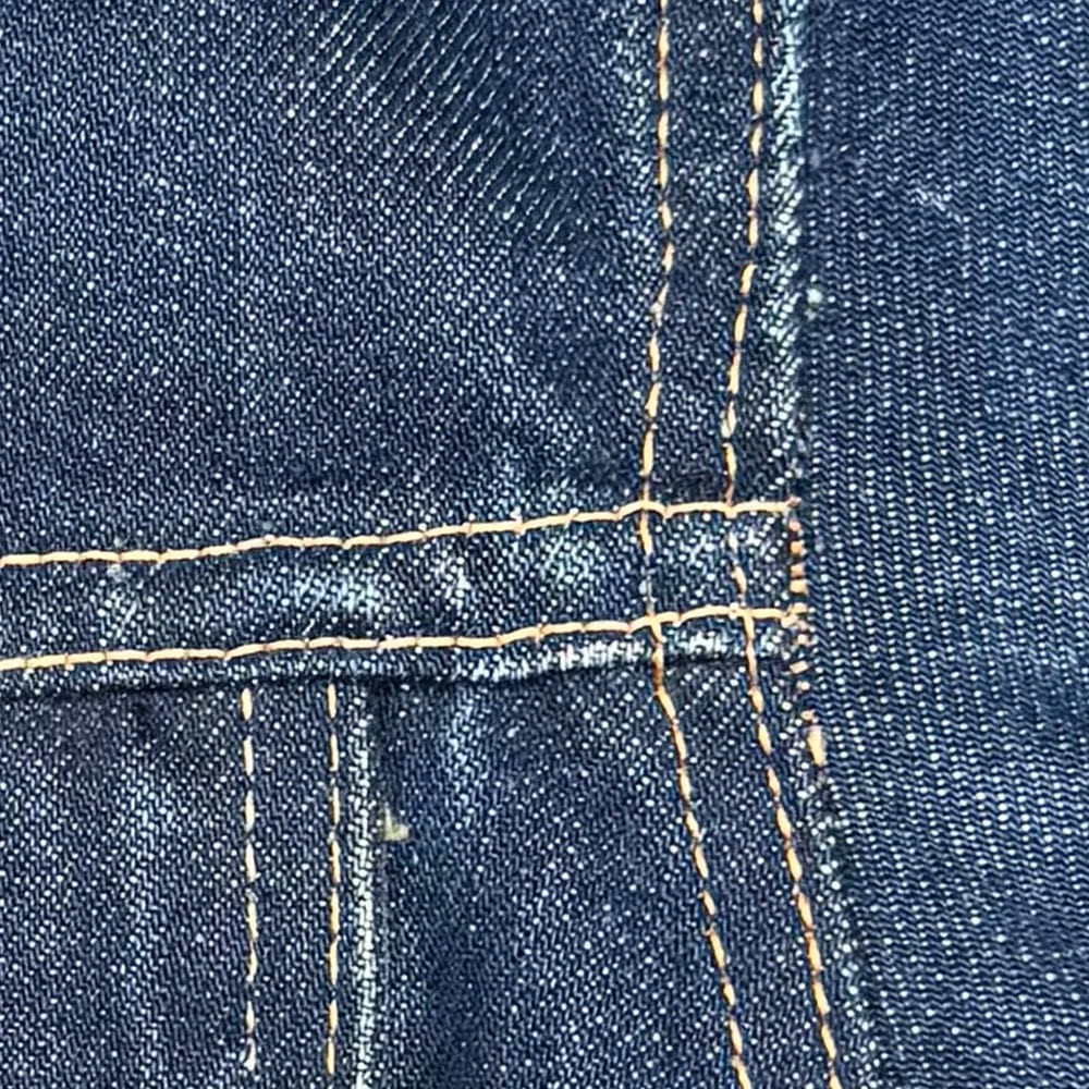 - アジャスターボタン取り付け部のステッチ仕様は、当時の製造工場や年代によって多様性が見られます。リーバイスにおいては、生産拠点ごとの技術的解釈や作業者の裁量によって、取り付け方法に微細な違いが生じていました。DUDE BUNCHでは、実在するヴィンテージ個体のディテールをもとに、その仕様を忠実に再現しています。もし当時のオリジナルピースをご覧いただく機会があれば、ステッチワークの多様性を比較・検証していただけるはずです。こうしたディテールのばらつきにこそ、当時の大量生産体制における許容幅や、リーバイス特有の“寛容性”を見出すことができます。