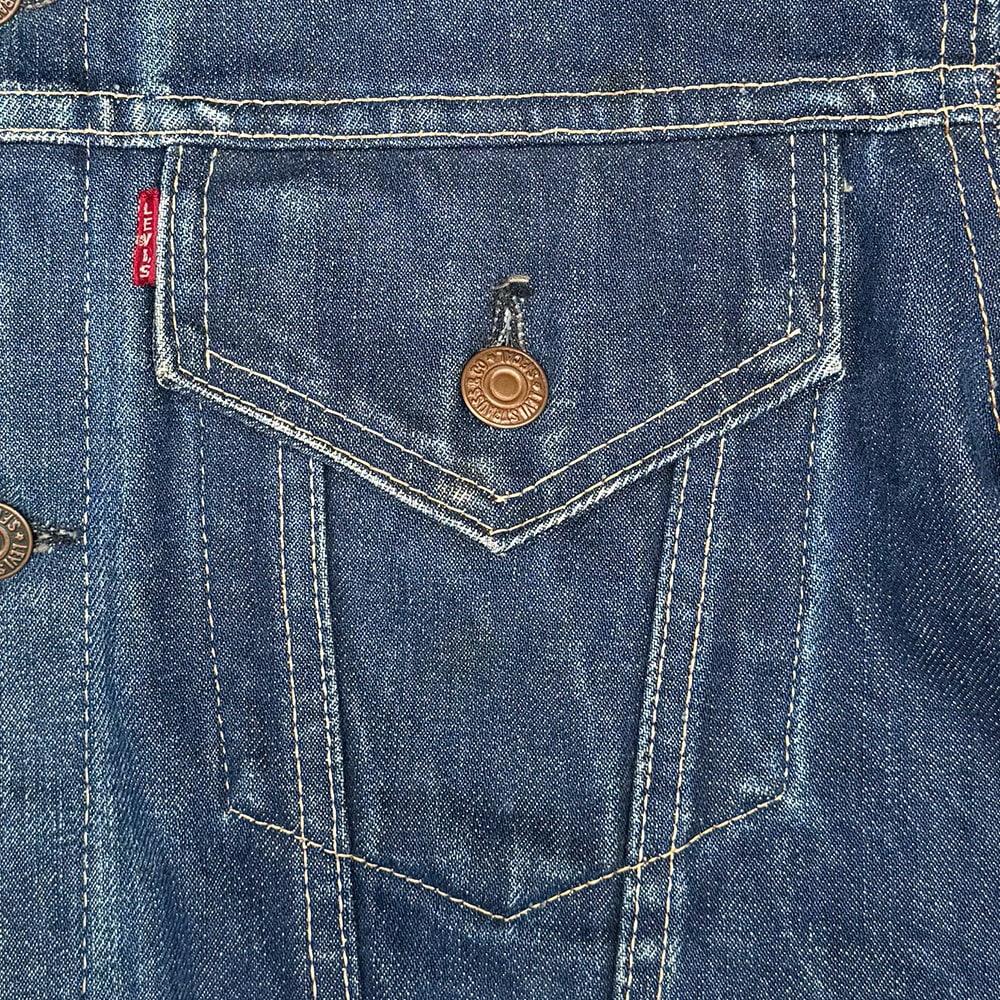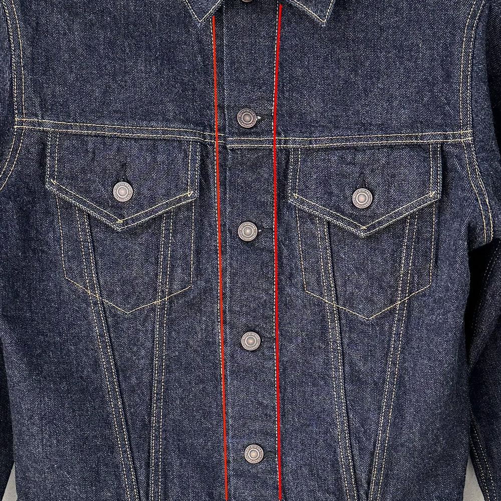 - リーバイス3rd型ジャケットの特徴でもある、上方向に広がる前立てのステッチ。このディテールは、シルエットにシャープさを与え、よりマスキュリンな印象を強調する要素だと考えています。今回はそのイメージを踏襲し、同様のステッチワークで再現いたしました。