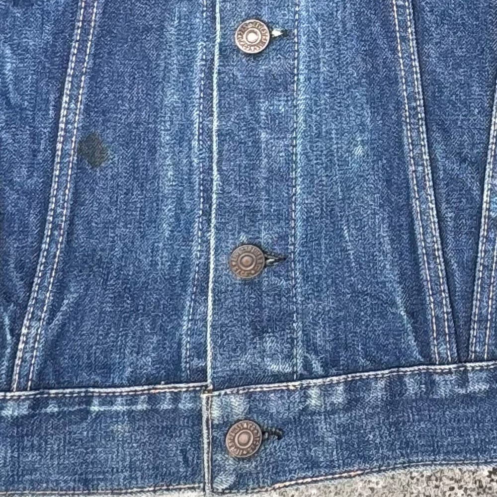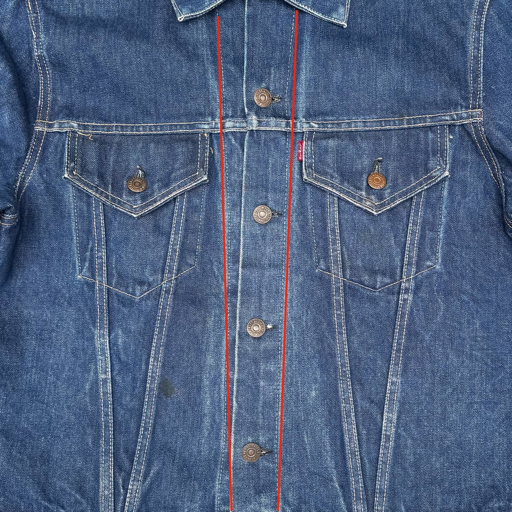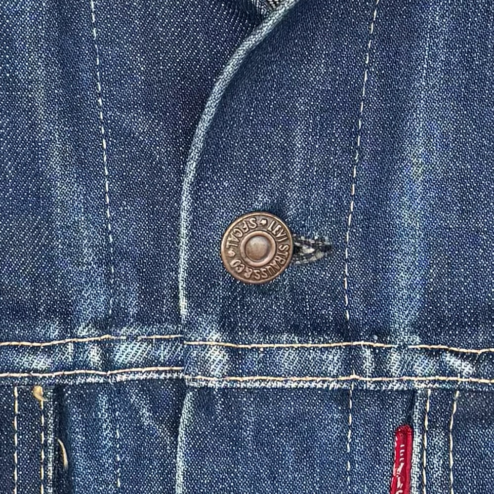 - 第5ボタンと第6ボタンの間だけ明らかに不均等なボタンピッチとなっている点も、当時のリーバイス製品に見られる興味深いディテールのひとつです。寸法のばらつきがあってもB品扱いされず市場に流通していた背景には、量産現場ならではの“おおらかさ”が表れています。こうした個体差こそヴィンテージの魅力であり、DUDE BUNCHが再現したいディテールです。