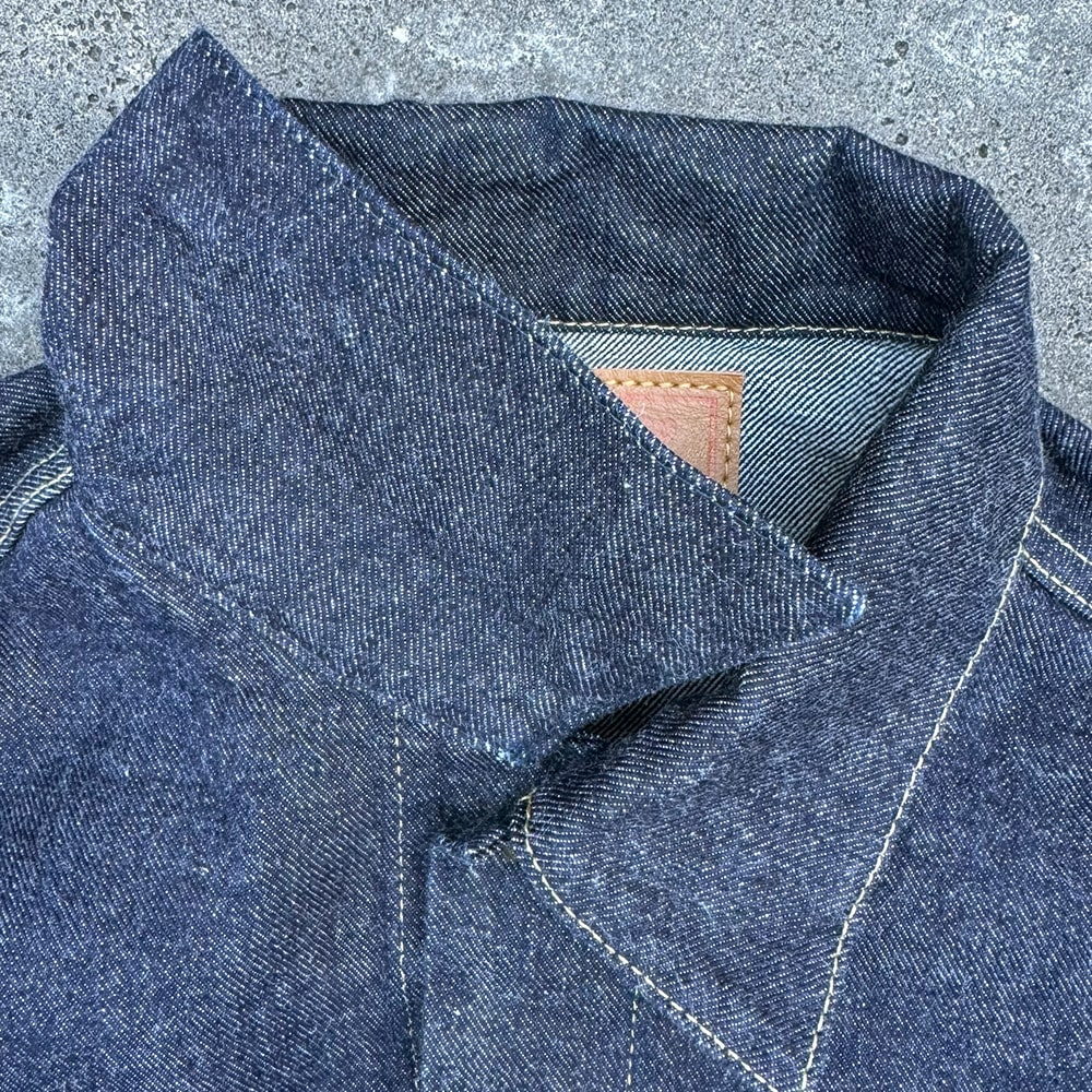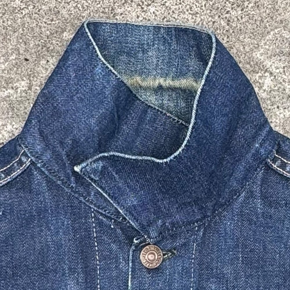 - 今回のモデルでは、襟裏の縫製仕様にも注目し、ディテールの再現性を高めるためにネイビーの縫製糸を採用しています。襟裏は着用時には見えにくい部分でありながら、ヴィンテージ個体においても工場や年代によって糸色にバリエーションが見られる箇所のひとつです。視認性の低い内側にも手を抜かず、当時の雰囲気や縫製ニュアンスを感じさせるため、今回は意図的にネイビーの糸で仕上げています。こうした“見えないこだわり”こそ、プロダクトとしての完成度を左右する要素であり、DUDE BUNCHにとっても重要なディテールとして再現しています。