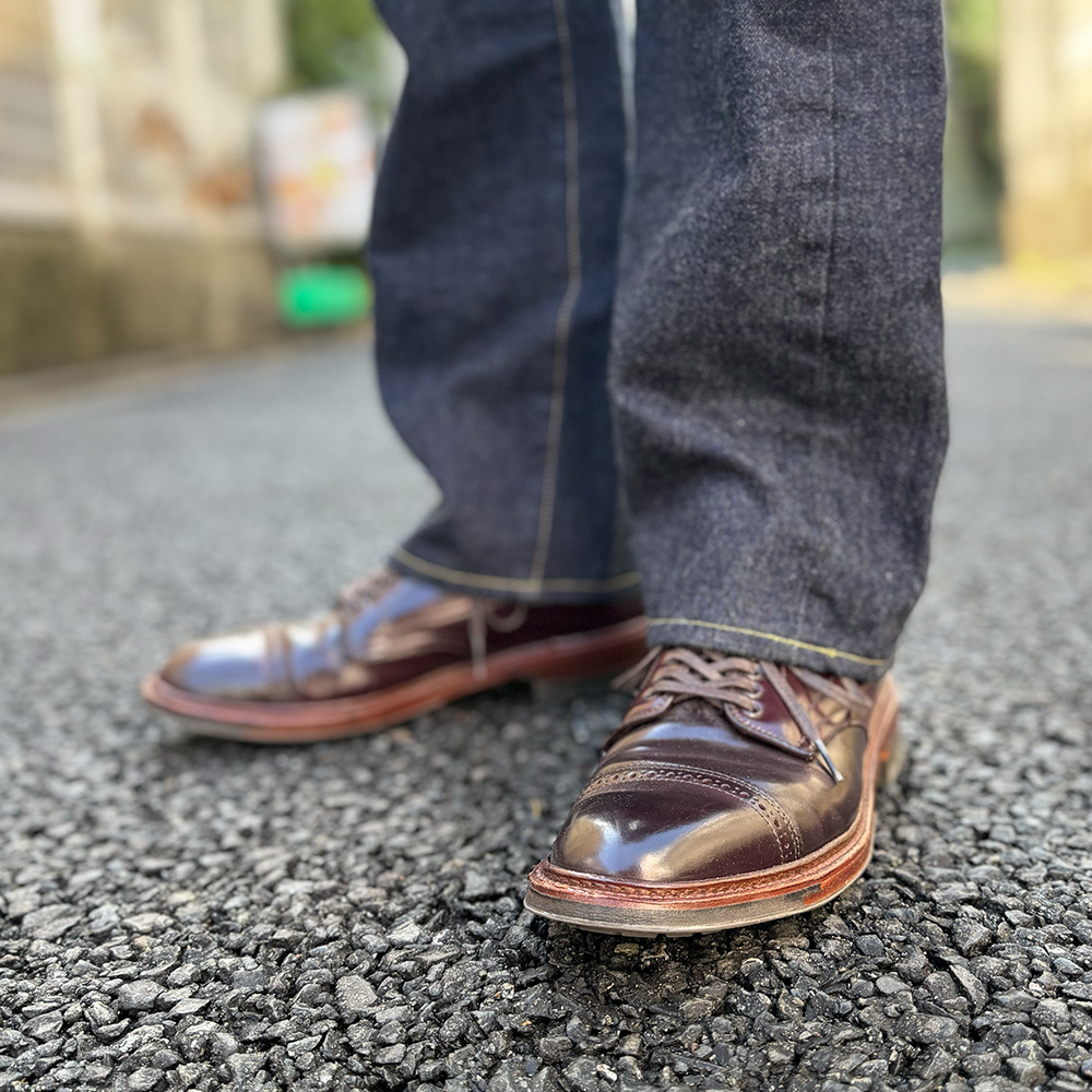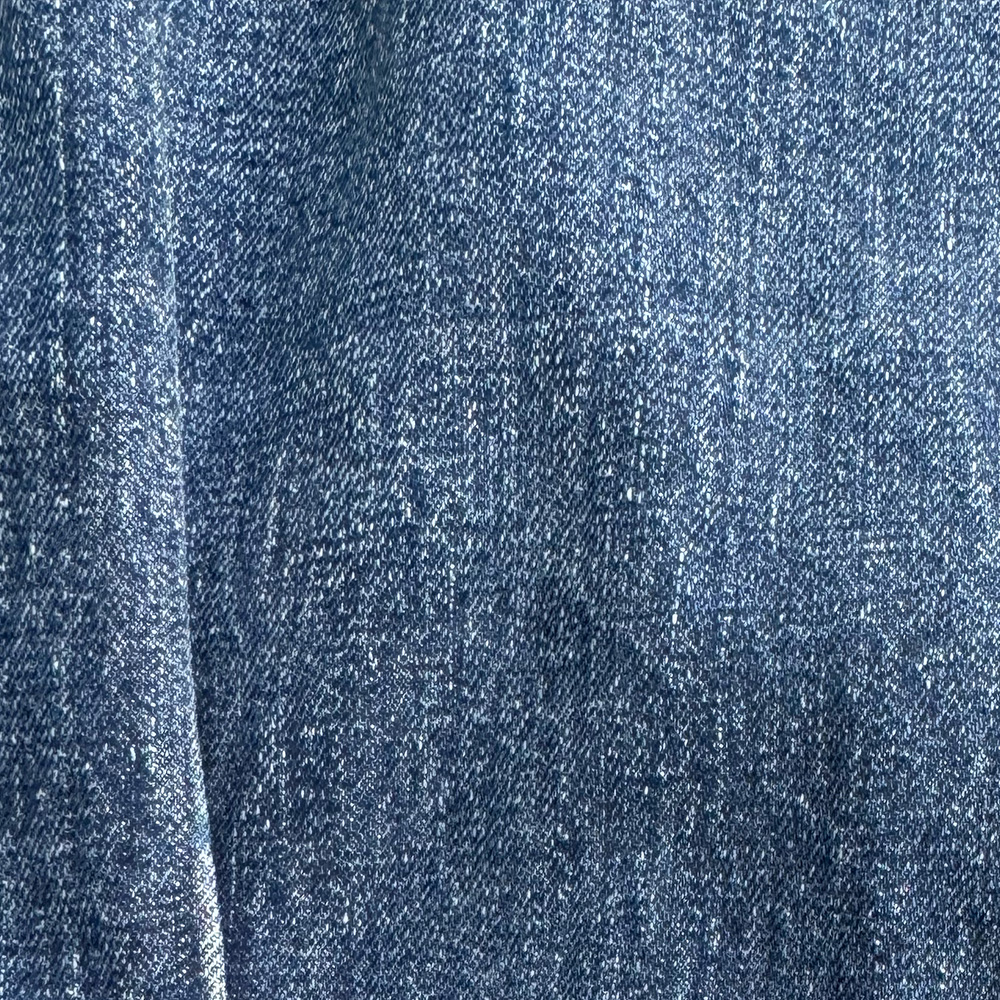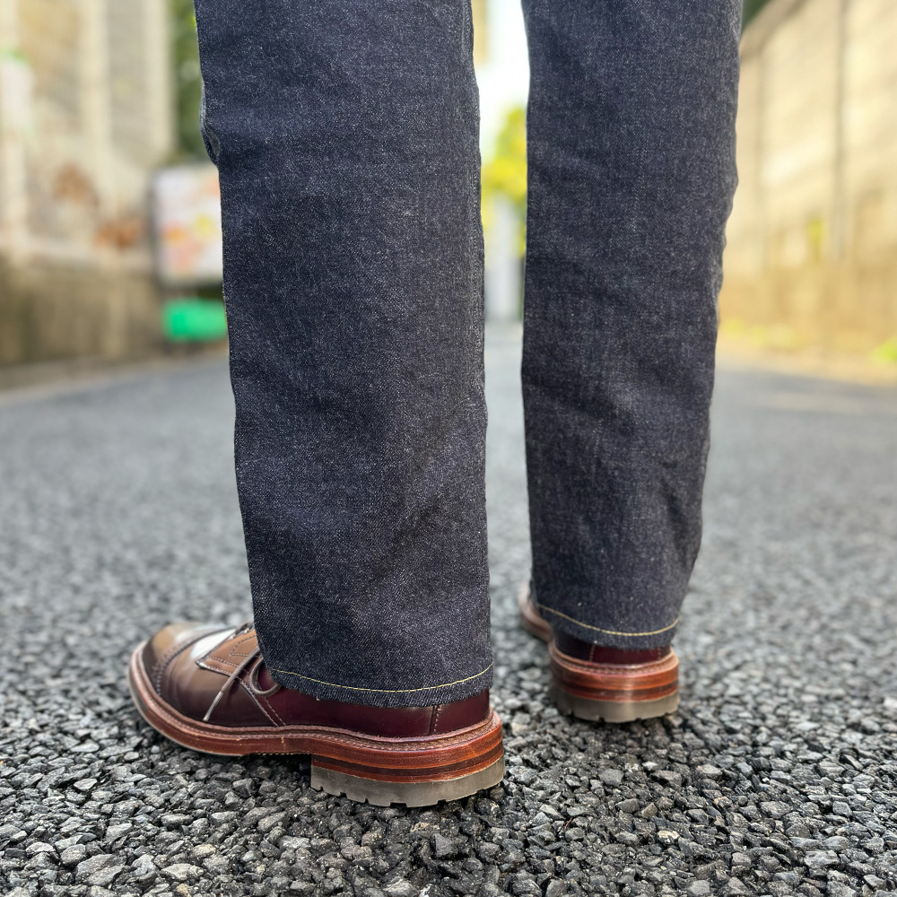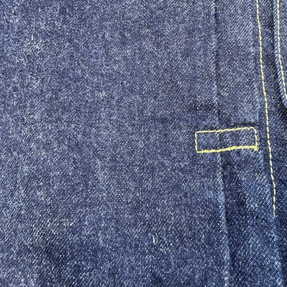 日本でも有数の個性的なデニム生地を生み出し続けている岡山県井原市のデニム生地工場。事務所は県の重要文化財にも指定されている老舗の生地工場です。栗原氏が所有するリーバイス501XX 1947年製モデルを持ち込み、経糸緯糸の本数や太さ、強めのネップ感、通常の染め回数よりも多く青黒い1947年特有の色味を再現したインディゴなど、日本綿布のノウハウが凝縮した至高の生地となります。防縮加工も毛焼き加工もしていない純粋な生機の生地ですので、履き込んでいくと全体が右に捩れていき、ヴィンテージ感を増していきます。今回のデュードバンチ製大戦モデルでは、リーバイスと同様右綾を採用していますので、これまでの実験的な変化とは違い、リーバイスのあの大戦モデルにグッと近づけた仕上がりを狙っております。