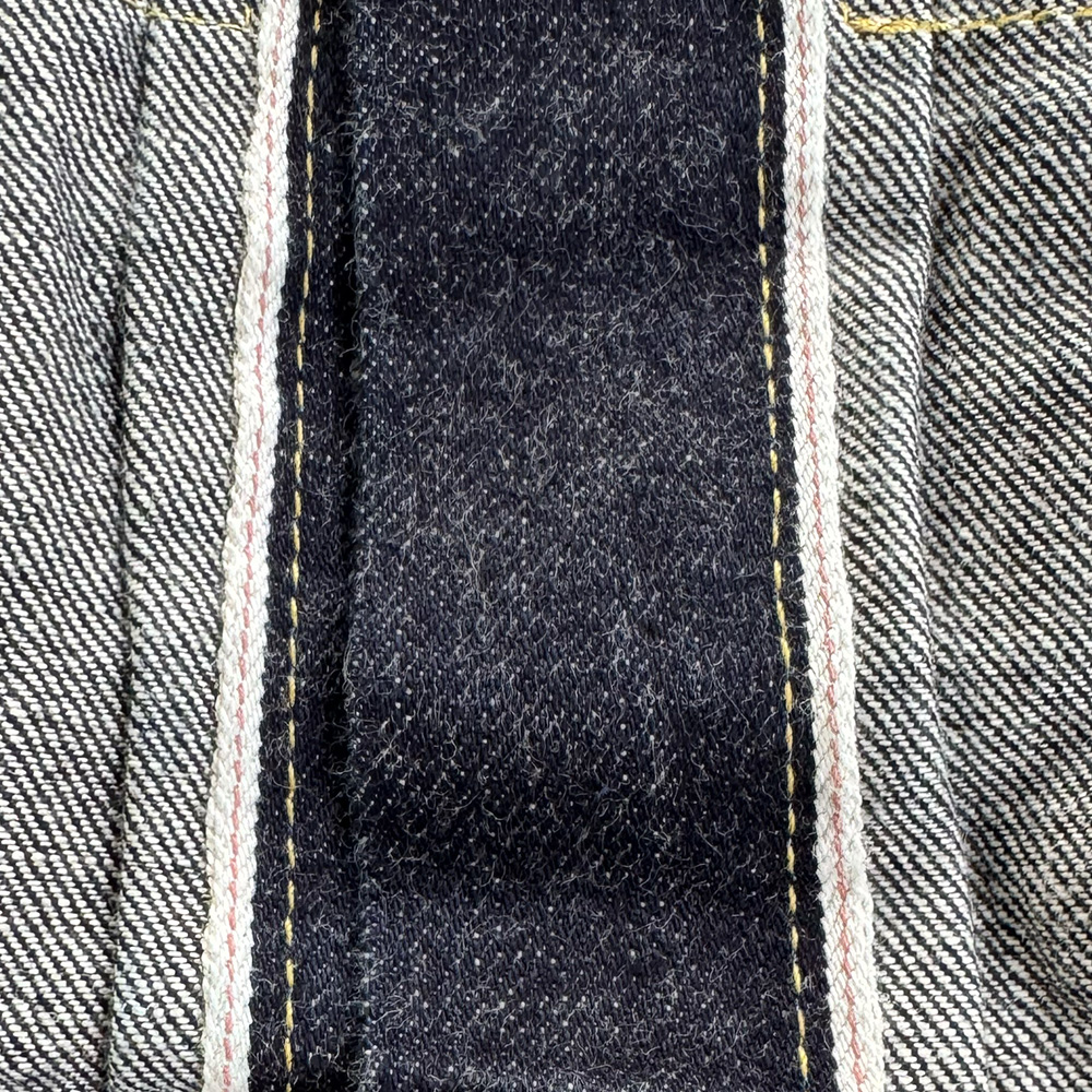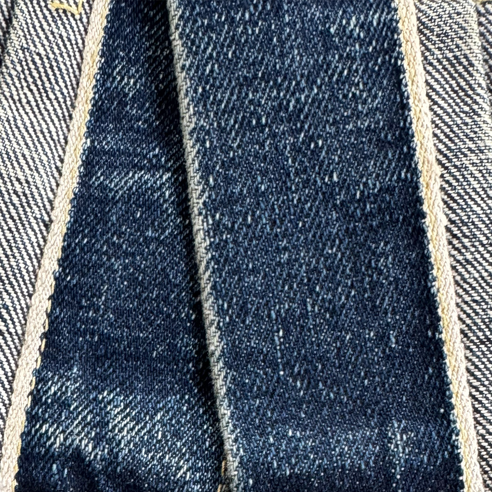デュードバンチの生地はセルビッチデニムと呼ばれる、旧式シャトル織機で丁寧に織り上げた希少なデニム生地です。端の「ミミ」部分にはほつれ止めが施され、あえてリーバイスと同じ赤い糸で仕上げられた「赤耳」は、ビンテージデニムの象徴のような意匠でもあります。通常のデニム生地の横巾が150cmあるのに対して、ミミのある旧式シャトル織機では80cmほどしか織れないのです。ゆっくりと織ることで生まれる生地のムラや凹凸が、穿き込むほどに美しいアタリを生み、経年変化を存分に楽しめます。セルビッチデニムとは、速度も遅く生産量も少なく、手間と時間をかけた生産のため、数量も限られた特別なデニム生地なのです。