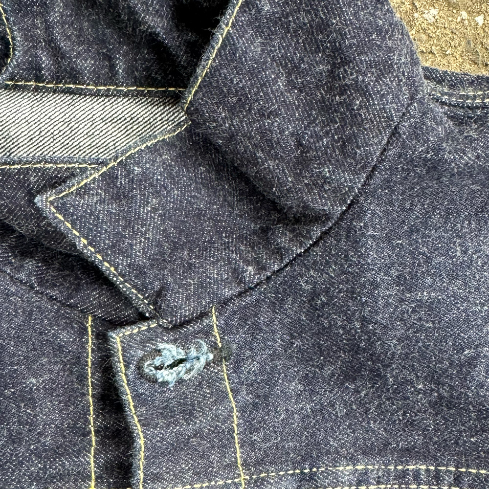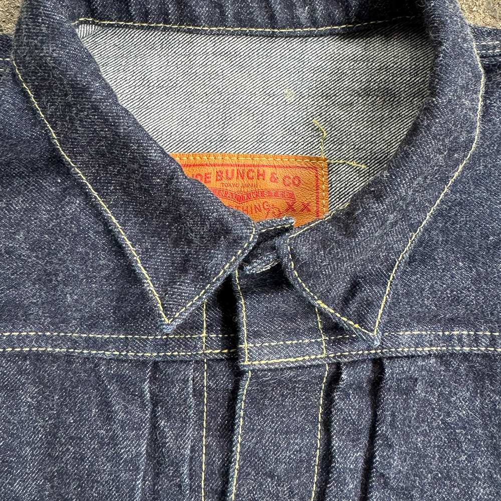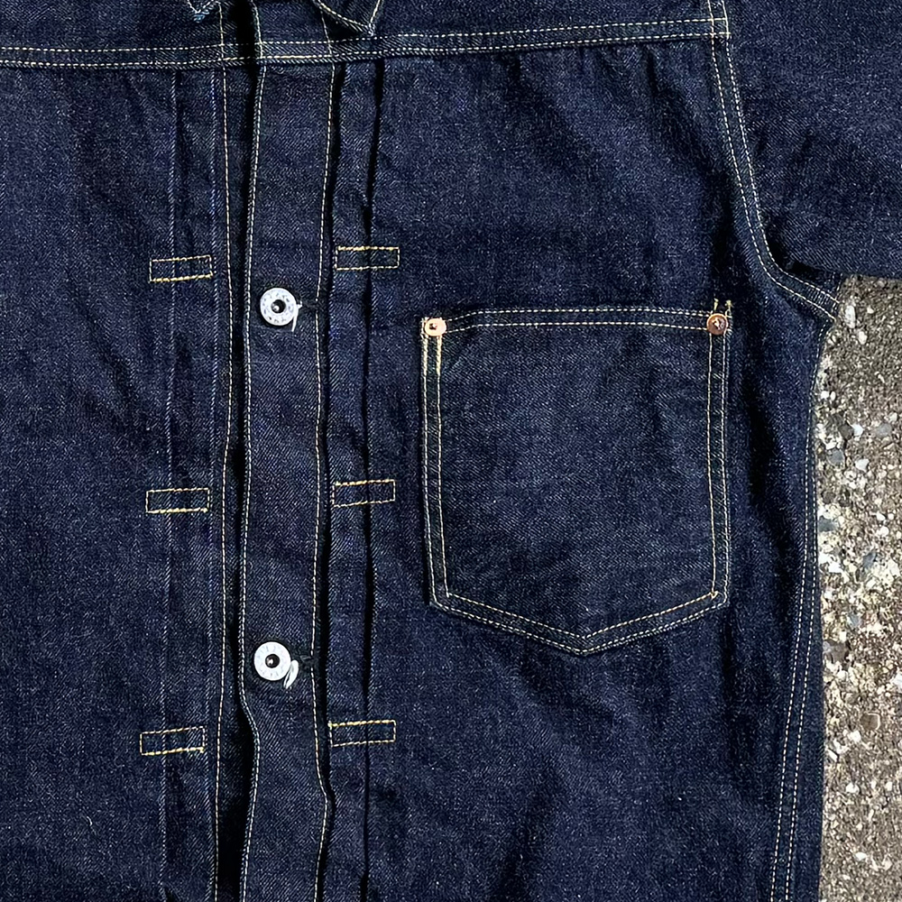 通常の1stジャケット(506XX)はフロントボタンが5つありますが、大戦期は資材節約のためにボタンが4つに簡略化されました。これが大きな外見上の特徴となっています。デュードバンチでは、栗原氏が所有するヴィンテージを元にボタンとボタンの間隔までミリ単位で計測し、大戦らしいバランスを構築しました。