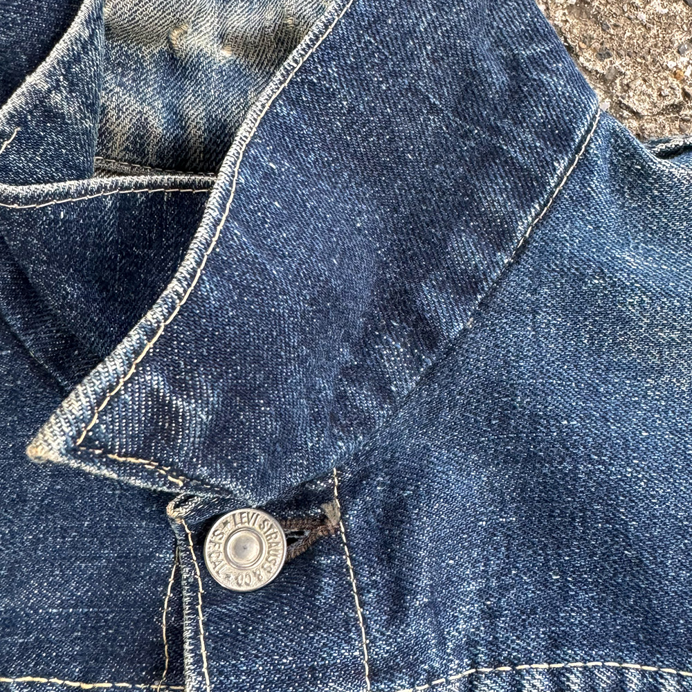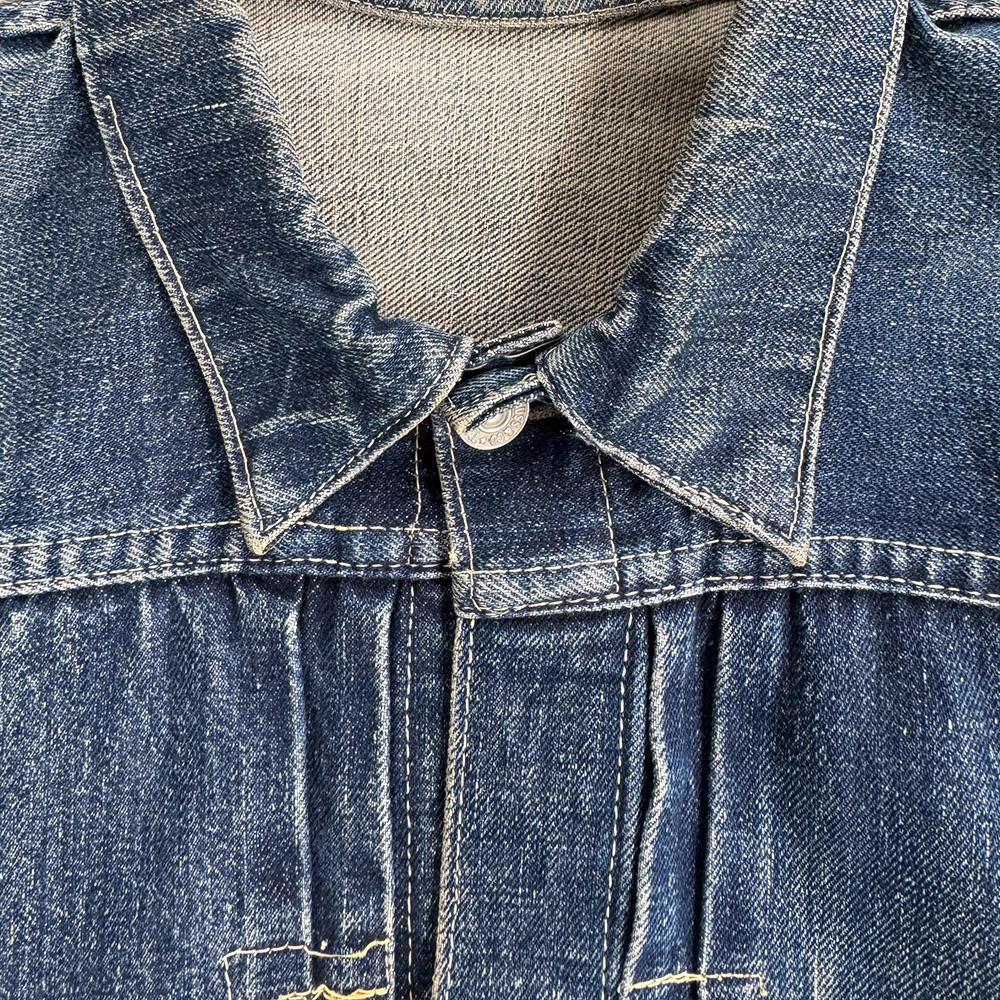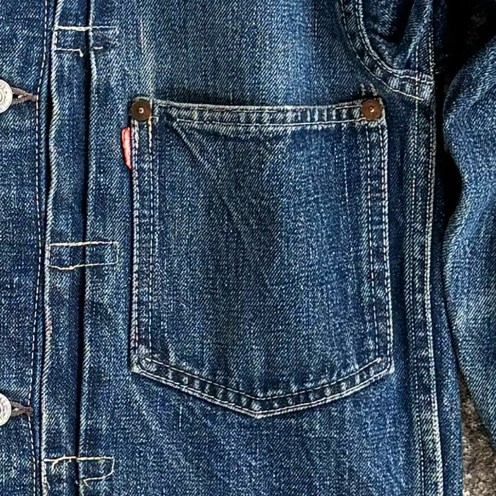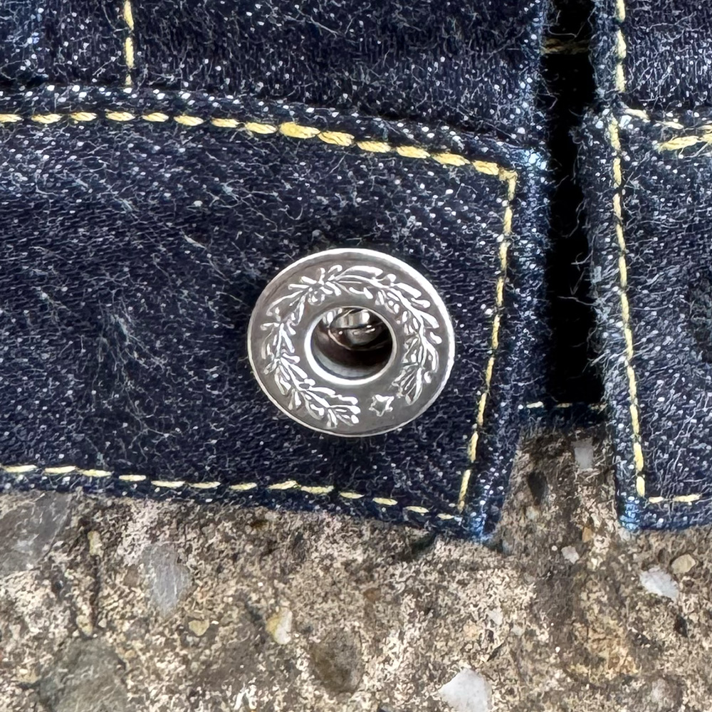 通常の1stジャケット(506XX)はフロントボタンが5つありますが、大戦期は資材節約のためにボタンが4つに簡略化されました。これが大きな外見上の特徴となっています。デュードバンチでは、栗原氏が所有するヴィンテージを元にボタンとボタンの間隔までミリ単位で計測し、大戦らしいバランスを構築しました。