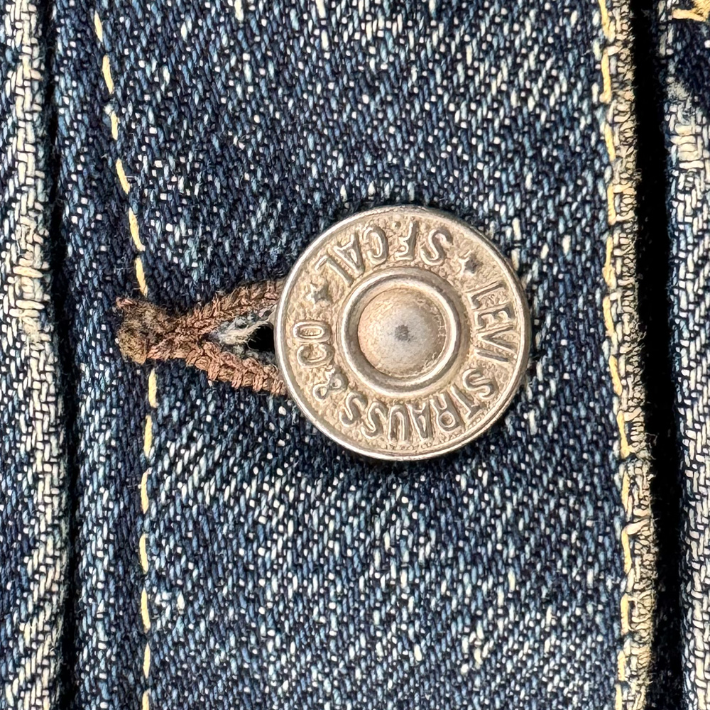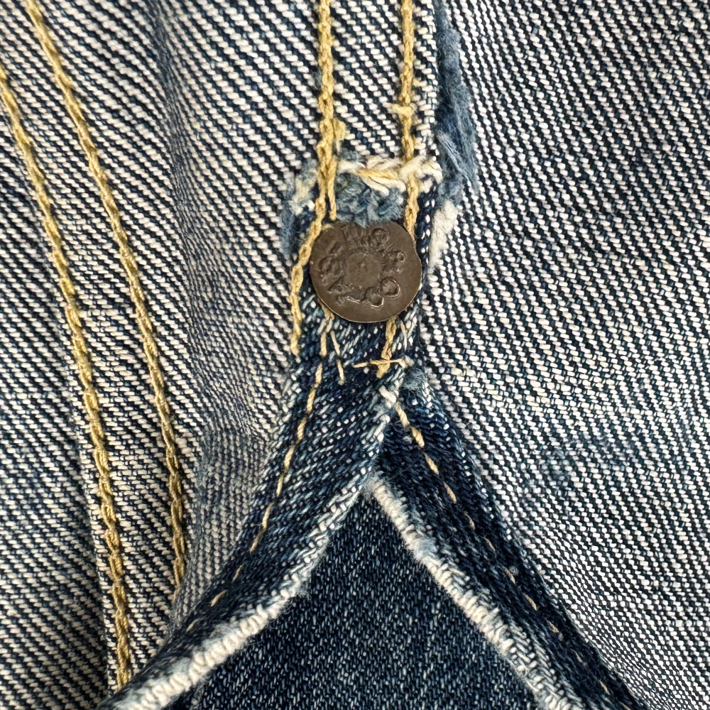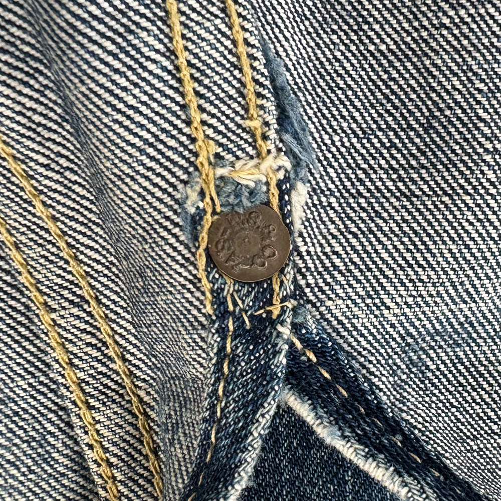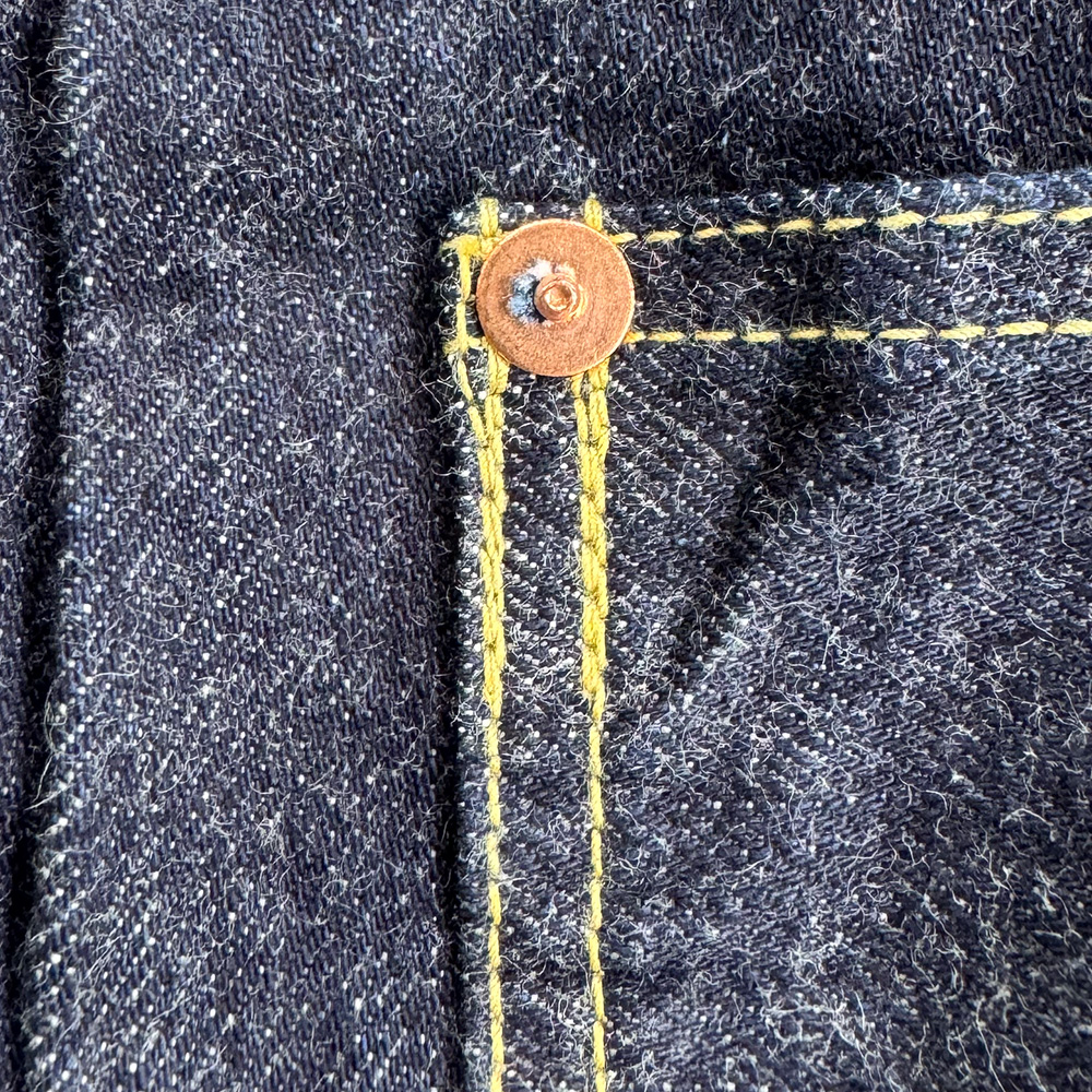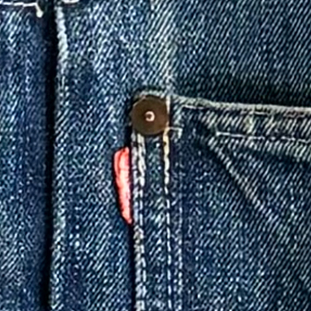 大戦モデルといえば鉄ボタンの採用です。戦時下の物資統制で銅を優先的に減らした過程で生まれた刻印などのない鉄ボタンを採用しています。鉄は錆びることから生地への負担もあり、現在ではあまり使われることがなくなってきており、扱っている会社も少なくなってきています。そんな中でも当然デュードバンチは鉄製ボタンをあしらっていますので、履き込んでいくことで錆び始めたボタンと褪色した生地のコントラストをお楽しみいただけます。※写真の506SXXは過渡期モデルで、ボタンが刻印になっています。