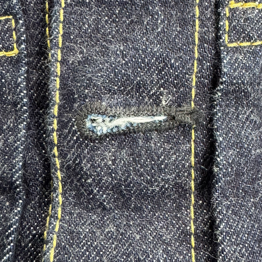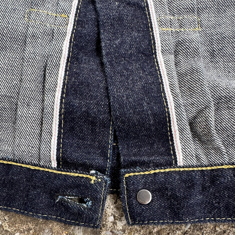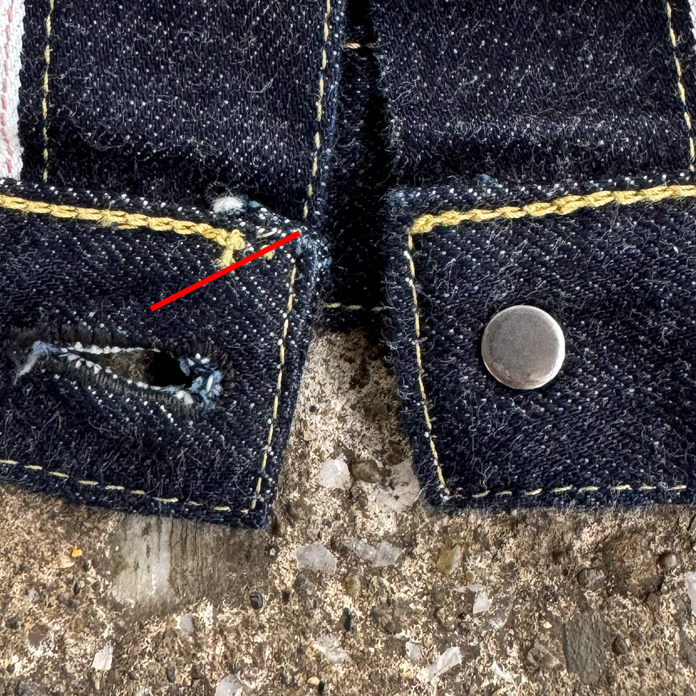 サンプリングしたヴィンテージの個体は、ステッチも雑で返し縫いもしていない、速度優先を伺わせるディテールとなっています。下手ウマを再現するのは非常に難しく、高い縫製技術で狙ってガタガタのディテールを再現しています。これこそが大戦モデルの雰囲気を醸し出す重要なディテールです
