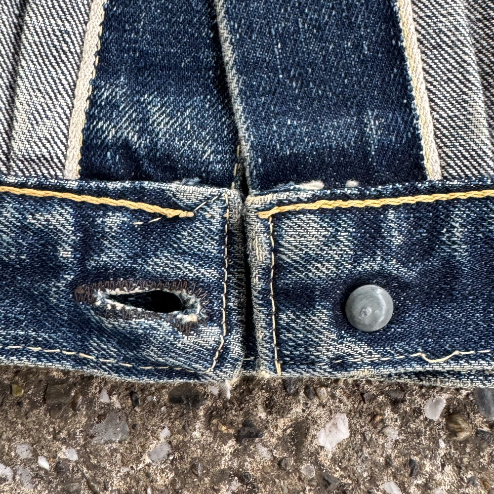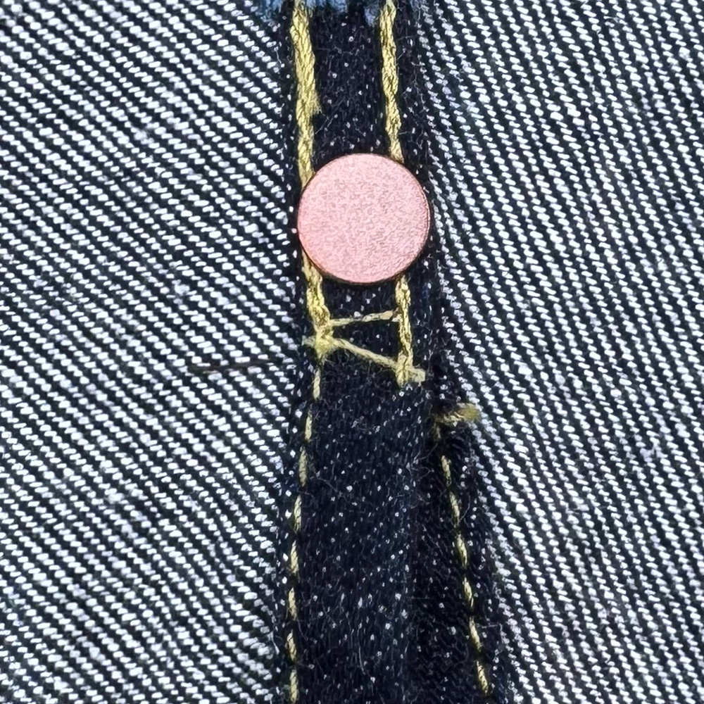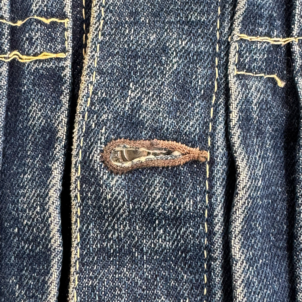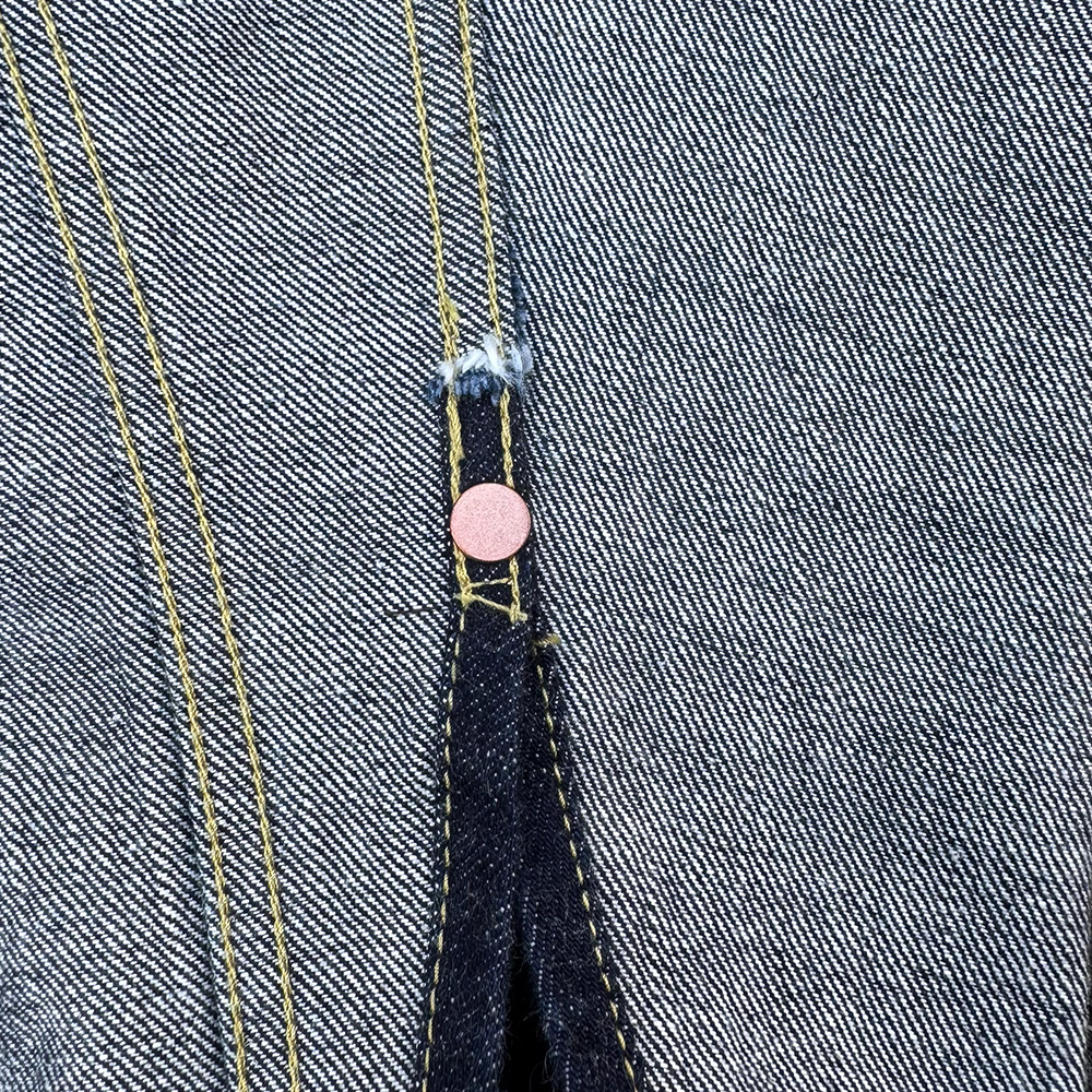 ヴィンテージを注意深く観察すると、ボタンホールの色がブラウンに褪色してなんとも言えない雰囲気を醸し出していることがわかります。これは黒色の綿糸が経年変化で褪色してブラウンになっているためです。デュードバンチのボタンホールも全て黒色の綿糸を採用しましたので、インディゴの色落ちと合わせて自然に褪色していきます。