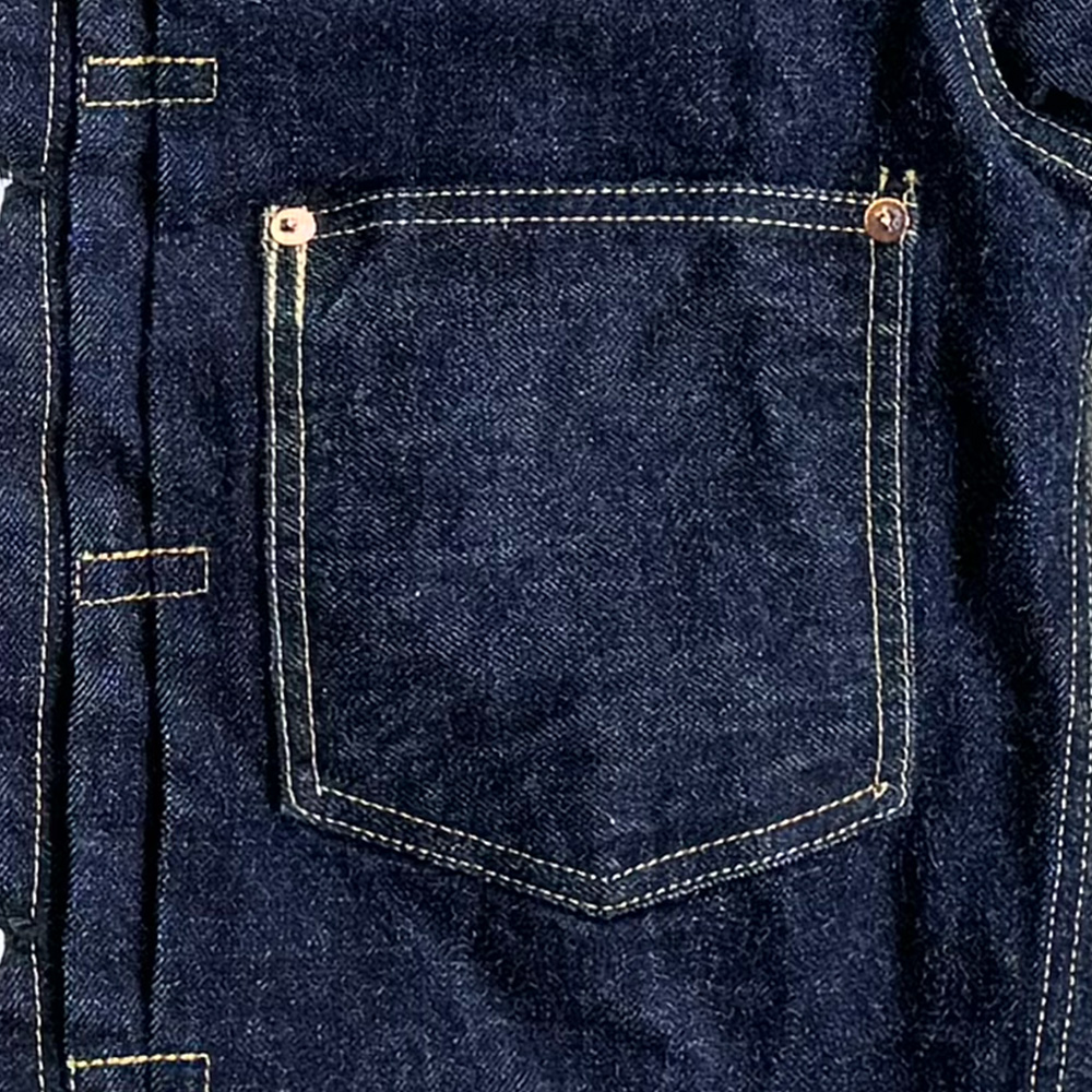 返し縫いの技術が未発達であった時代、縫製糸の端処理を安定させるために生まれたのがVステッチです。このVステッチ部分は縫い手の技術や癖が色濃く表れる個性豊かなディテールであり、今回の製作でも参考としたヴィンテージ個体の仕様を忠実に再現しています。ヴィンテージデニムを手に取る機会があれば、ぜひこのVステッチに注目してみてください。各個体ごとに異なる多様なパターンが存在していることが確認できます。国内の優れた縫製工場の高い技術の場合、綺麗で正確なステッチワークは得意なのですが、逆にこの下手ウマを再現するのが非常に難しく、狙ってこのステッチワークを再現するためにさらに高い技術を要しています。