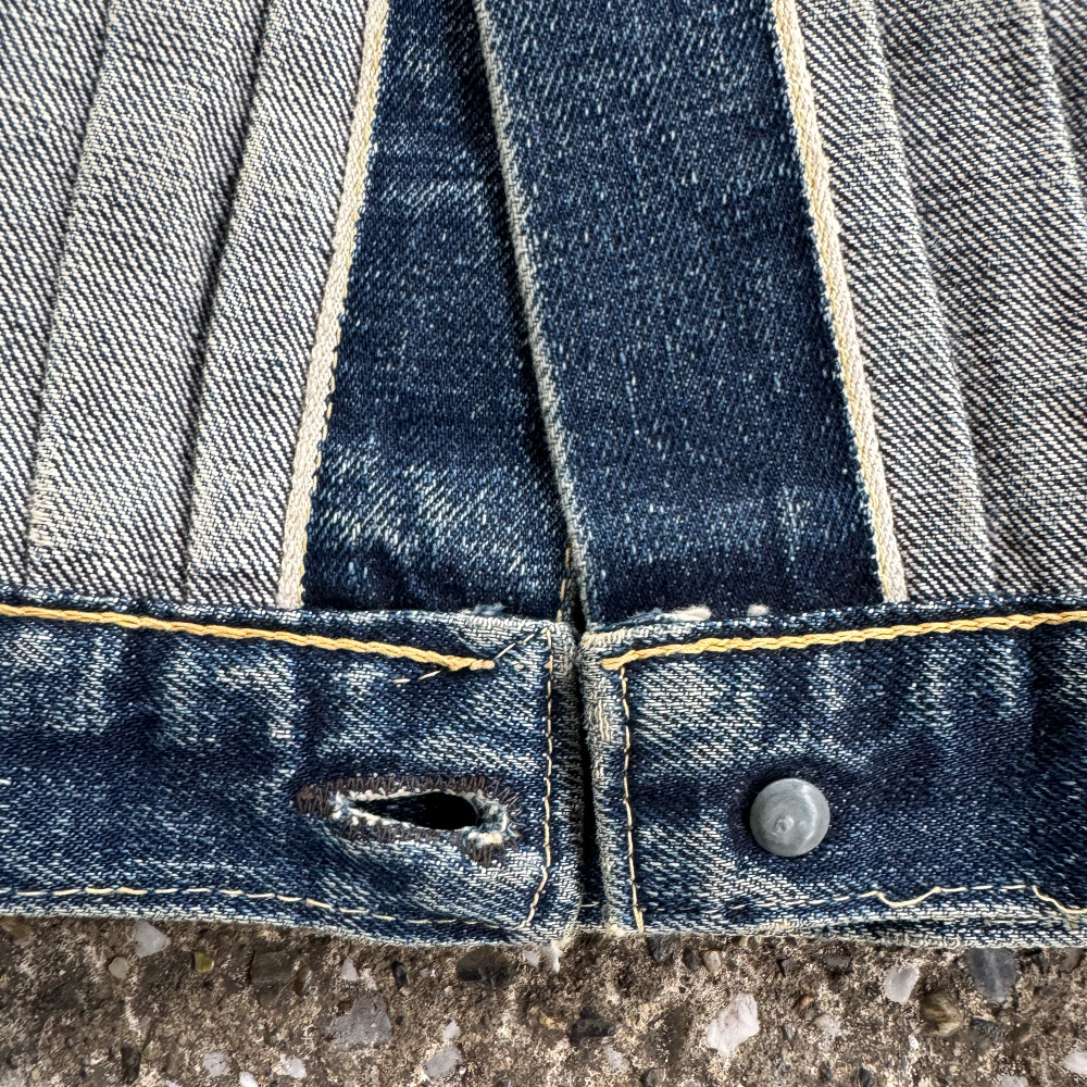チェーンステッチが解けるのを押さえる為にVステッチの返し縫いがあり、ジャケットの裾の縫製はパンツのウェストの付け方と同じであることが分かりました。細かいステッチワークまで忠実に再現しています。生地と綿糸の収縮でギャザーが寄り、独特のアタリが生まれていきます。