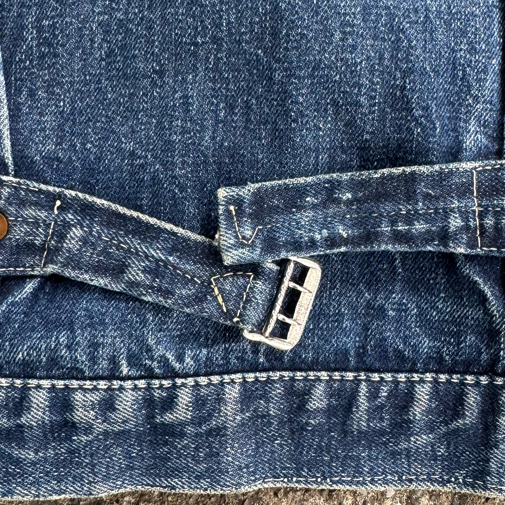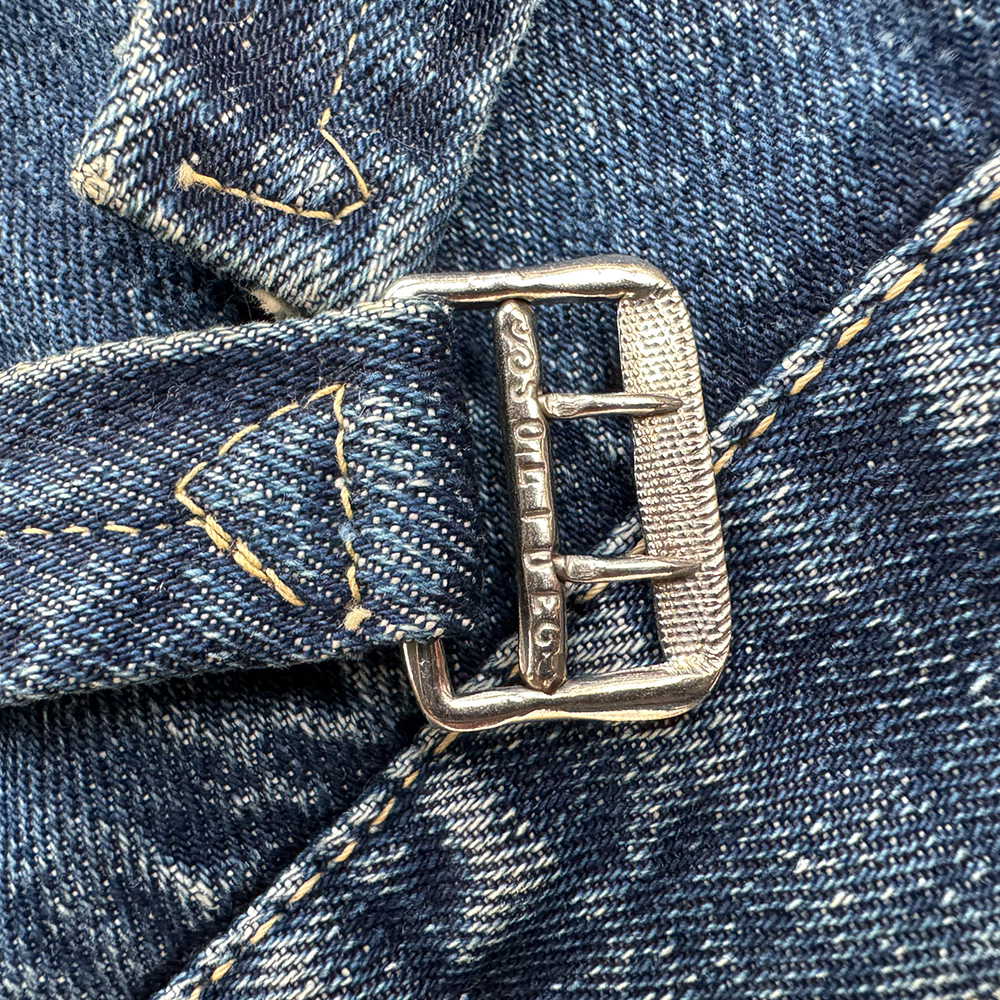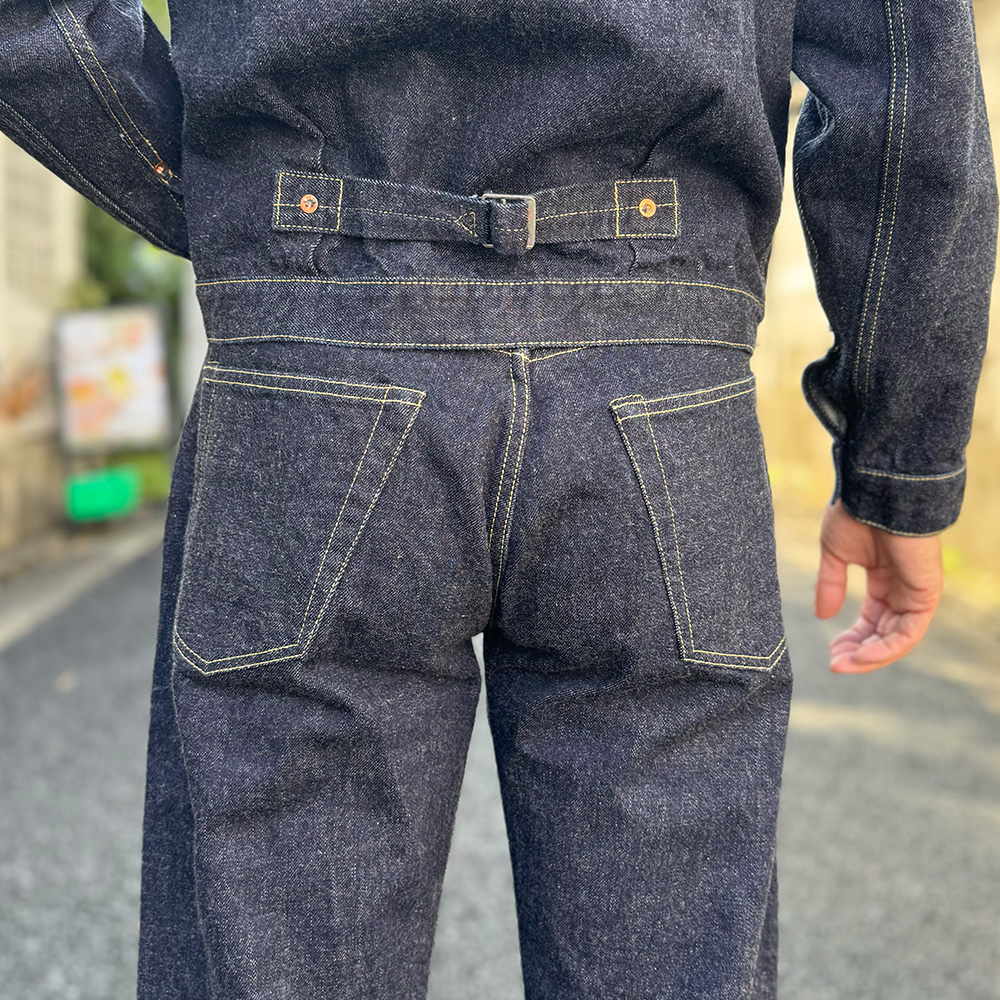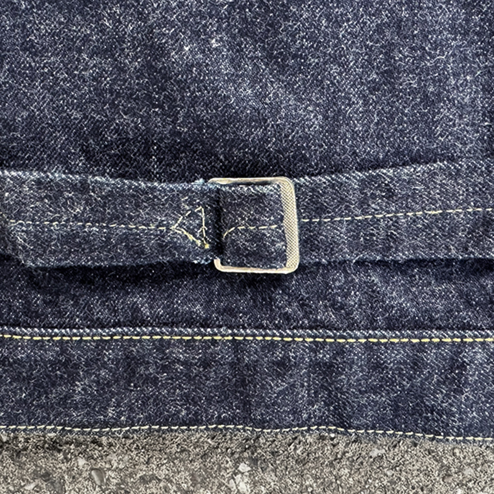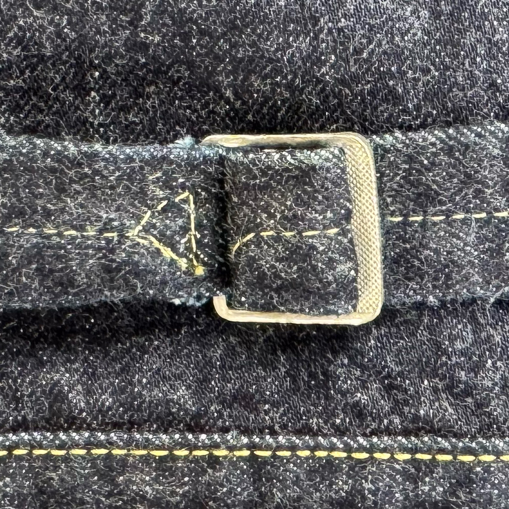 大戦モデルの特徴の一つ、バックルの金具はリーバイス刻印のオリジナルではなく、汎用性の鉄製金具が使われています。ユリの刻印がされていることから通称ユリバックルと呼ばれるディテールです。デュードバンチではこの鉄製ユリバックルを調達しサイズも合わせてきちんと採用しています。※写真のセカンドサンプルはユリバックルになっていません。製品版はサイズも合わせたユリバックルが付く予定です。