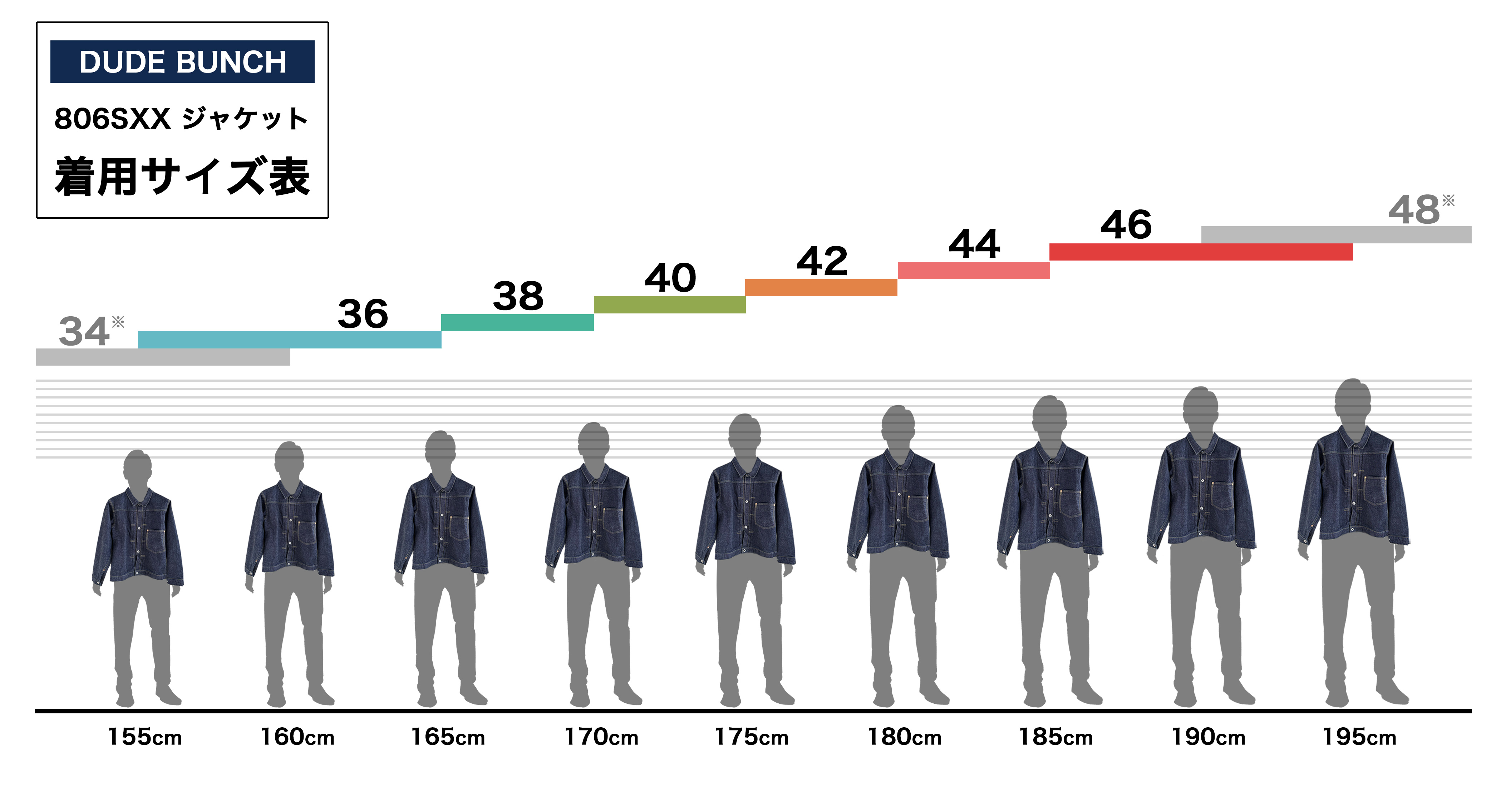 ※着用サイズ表は、身幅にややゆとりがあり、着丈が短めの往年のファーストモデルをイメージした着用感を基準として作成しております。